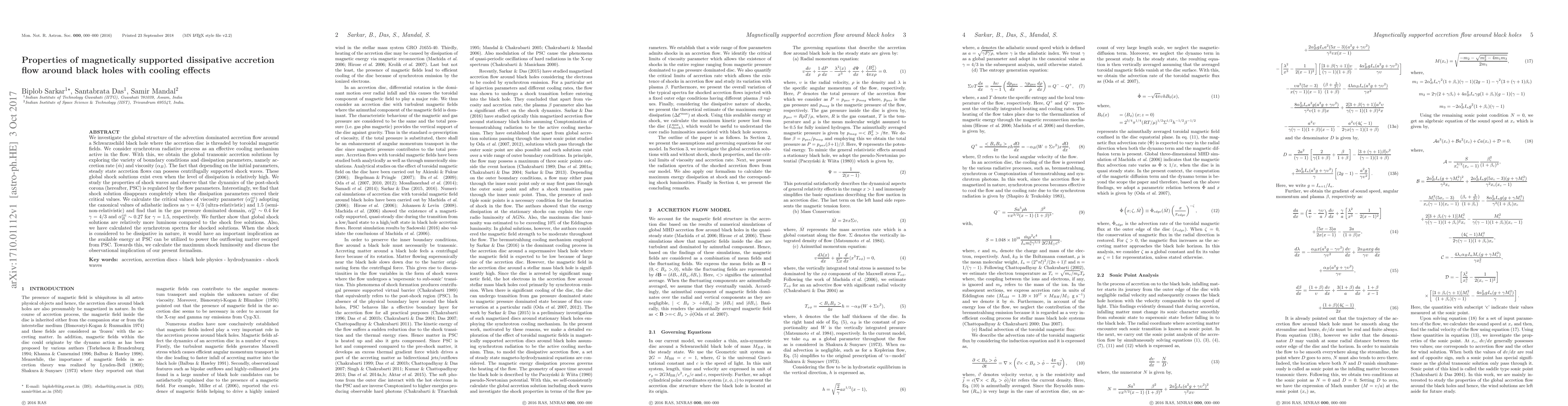 This research explores the global structure of accretion flows around Schwarzschild black holes, threaded by toroidal magnetic fields. Utilizing synchrotron radiative cooling, it derives transonic accretion solutions for various boundary conditions and dissipation parameters. The study identifies critical viscosity values ($alpha^{ m cri}_B$) for shock wave formation, dependent on the adiabatic index (0.4 for $gamma=4/3$, 0.27 for $gamma=1.5). Shock solutions are found to be more luminous, and their dissipative nature could power outflows. The findings have implications for observing magnetically supported, dissipative accretion flows around black holes.