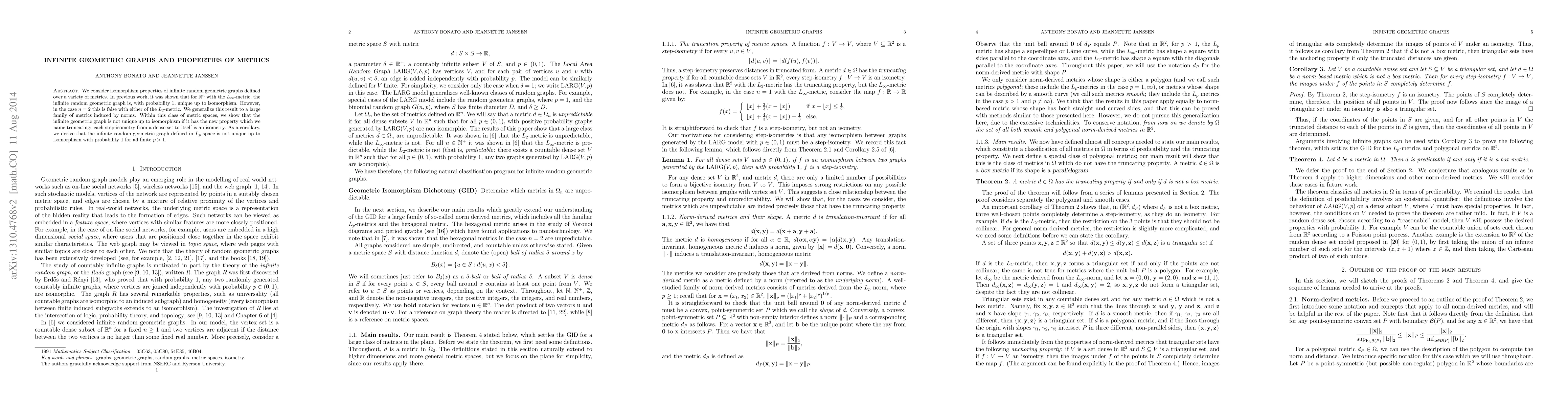 We consider isomorphism properties of infinite random geometric graphs defined over a variety of metrics. In previous work, it was shown that for $\mathbb{R}^n$ with the $L_{\infty}$-metric, the infinite random geometric graph is, with probability 1, unique up to isomorphism. However, in the case $n=2$ this is false with either of the $L_2$-metric. We generalize this result to a large family of metrics induced by norms. Within this class of metric spaces, we show that the infinite geometric graph is not unique up to isomorphism if it has the new property which we name truncating: each step-isometry from a dense set to itself is an isometry. As a corollary, we derive that the infinite random geometric graph defined in $L_p$ space is not unique up to isomorphism with probability 1 for all finite $p>1.$