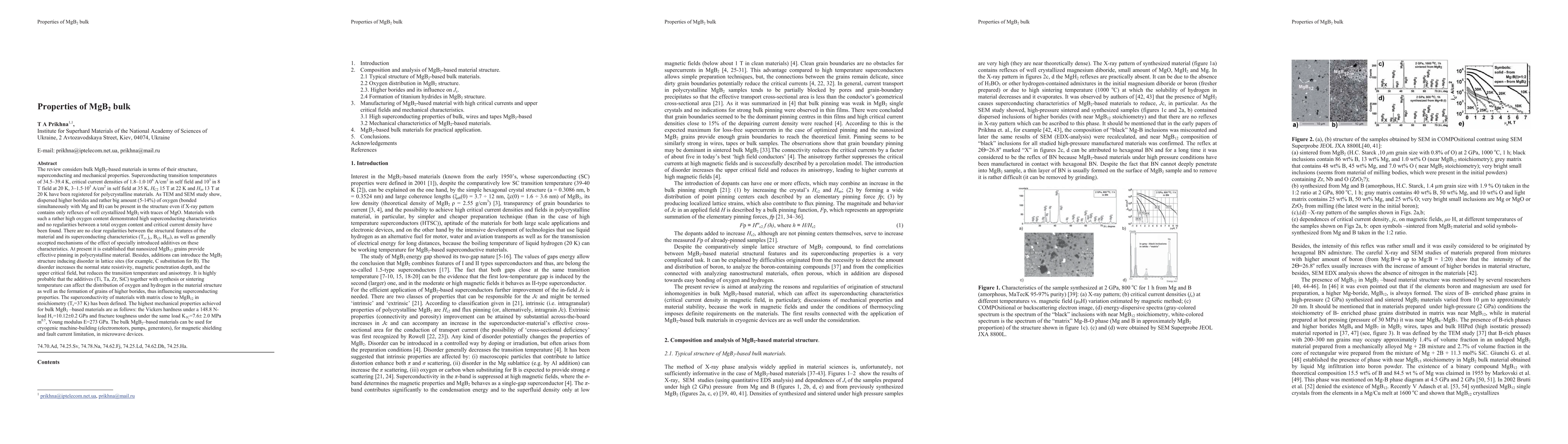 The review considers bulk MgB2-based materials in terms of their structure, superconducting and mechanical properties. Superconducting transition temperatures of 34.5-39.4 K, critical current densities of 1.8-1.0 x E6 A/sq.cm in self field and 103 in 8 T field at 20 K, 3-1.5xE5 A/sq. cm in self field at 35 K, HC2 15 T at 22 K and Hirr 13 T at 20 K have been registered for polycrystalline materials. As TEM and SEM study show, dispersed higher borides and rather big amount (5-14 percents) of oxygen (bonded simultaneously with Mg and B) can be present in the structure even if X-ray pattern contains only reflexes of well crystallized MgB2 with traces of MgO. Materials with such a rather high oxygen content demonstrated high superconducting characteristics. At present it is established that nanosized MgB12 grains provide effective pinning in polycrystalline material. Besides, additions can introduce the MgB2 structure inducing disorder in lattice sites (for example, C substitution for B). The disorder increases the normal state resistivity, magnetic penetration depth, and the upper critical field, but reduces the transition temperature and anisotropy. It is highly probable that the additives (Ti, Ta, Zr, SiC) together with synthesis or sintering temperature can affect the distribution of oxygen and hydrogen in the material structure as well as the formation of grains of higher borides, thus influencing superconducting properties. The superconductivity of materials with matrix close to MgB12 in stoichiometry (Tc=37 K) has been defined.