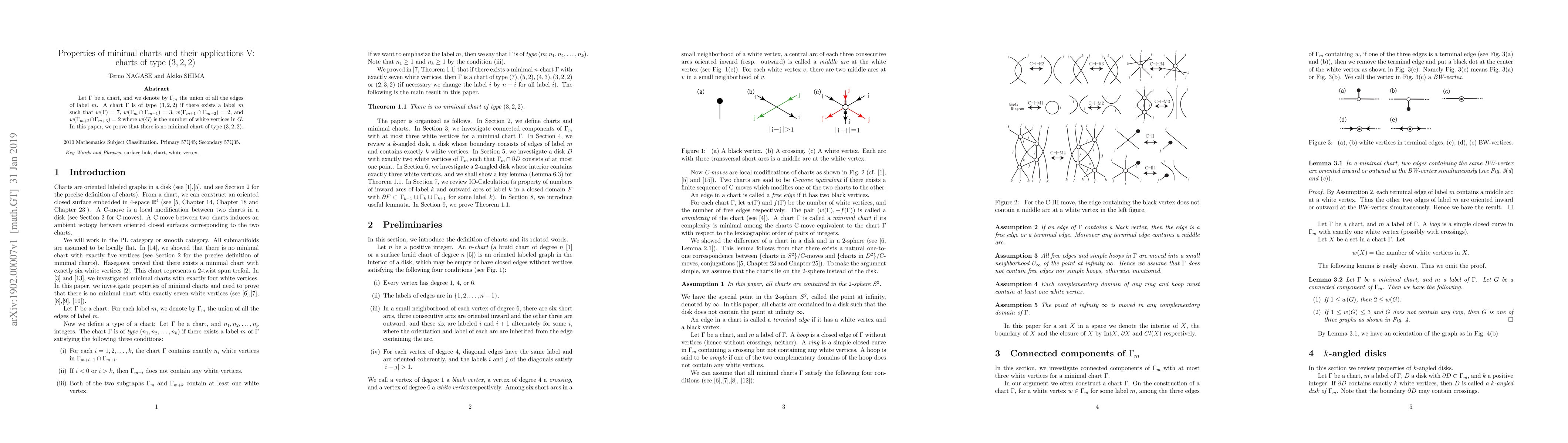 Let $\Gamma$ be a chart, and we denote by $\Gamma_m$ the union of all the edges of label $m$. A chart $\Gamma$ is of type $(3,2,2)$ if there exists a label $m$ such that $w(\Gamma)=7$, $w(\Gamma_m\cap\Gamma_{m+1})=3$, $w(\Gamma_{m+1}\cap\Gamma_{m+2})=2$, and $w(\Gamma_{m+2}\cap\Gamma_{m+3})=2$ where $w(G)$ is the number of white vertices in $G$. In this paper, we prove that there is no minimal chart of type $(3,2,2)$.