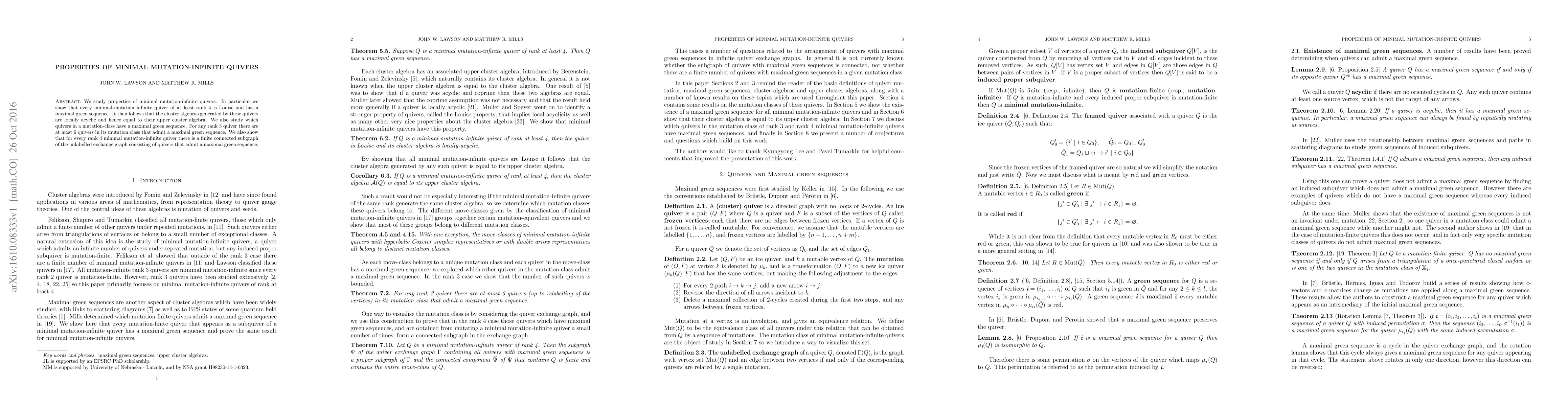 We study properties of minimal mutation-infinite quivers. In particular we show that every minimal-mutation infinite quiver of at least rank 4 is Louise and has a maximal green sequence. It then follows that the cluster algebras generated by these quivers are locally acyclic and hence equal to their upper cluster algebra. We also study which quivers in a mutation-class have a maximal green sequence. For any rank 3 quiver there are at most 6 quivers in its mutation class that admit a maximal green sequence. We also show that for every rank 4 minimal mutation-infinite quiver there is a finite connected subgraph of the unlabelled exchange graph consisting of quivers that admit a maximal green sequence.