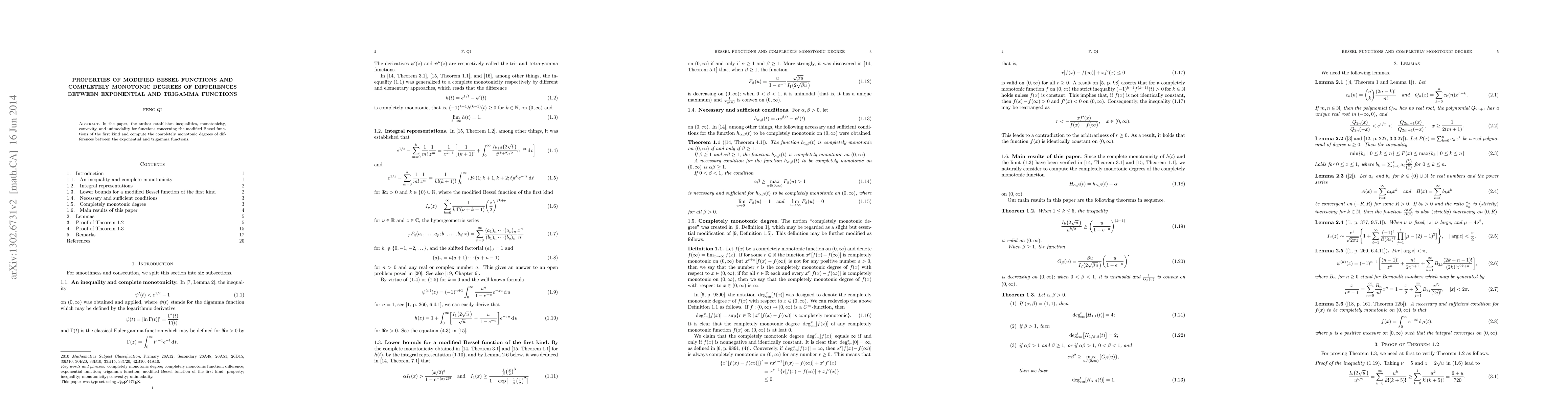 The paper investigates properties of modified Bessel functions, establishing inequalities, monotonicity, convexity, and unimodality, while also computing the completely monotonic degrees of differences between the exponential and trigamma functions.