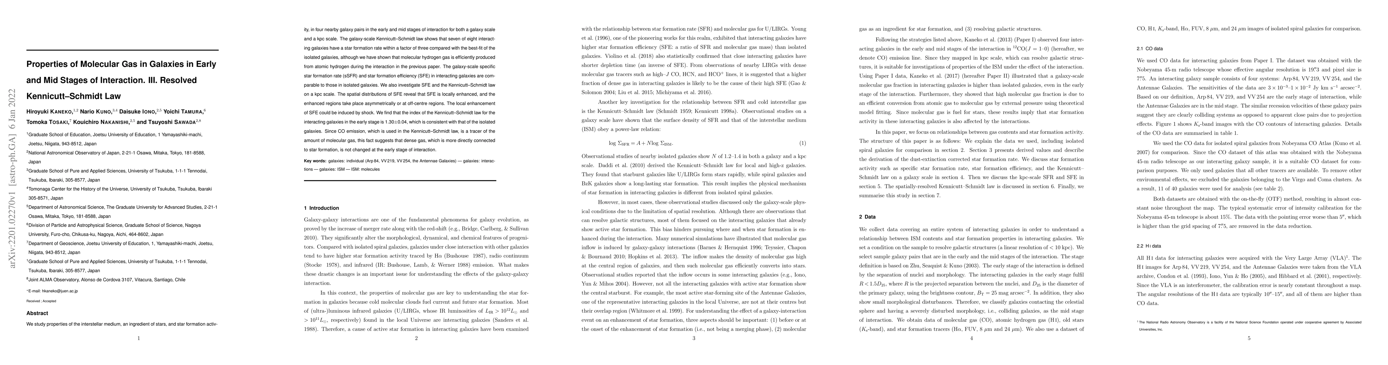 This paper investigates the interstellar medium and star formation in four galaxy pairs during early and mid-stage interactions, finding that star formation rates are comparable to isolated galaxies. On a kpc scale, the study reveals locally enhanced star formation efficiency, likely due to shock-induced processes, while the Kennicutt-Schmidt law index remains consistent between interacting and isolated galaxies, indicating that dense gas is preserved in the early stages of interaction.