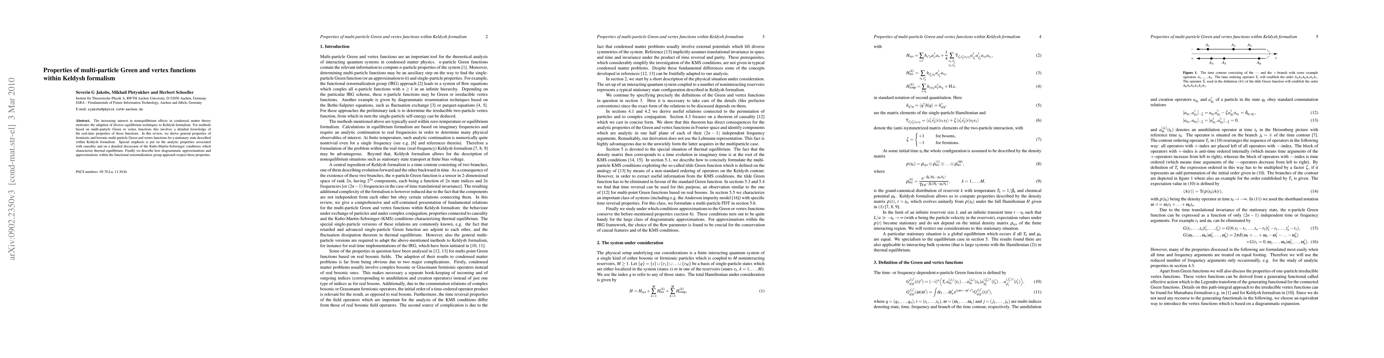 This paper derives general properties of multi-particle Green and vertex functions in the Keldysh formalism, focusing on their analytic properties related to causality and the Kubo-Martin-Schwinger conditions for thermal equilibrium. It also discusses how these properties are respected in diagrammatic approximations and the functional renormalisation group approach.