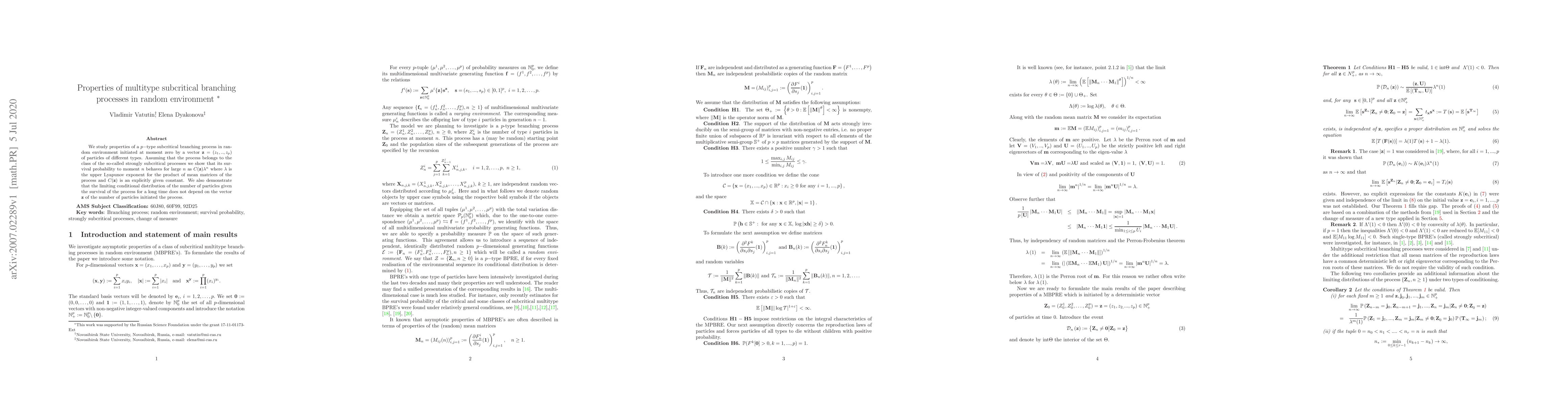 We study properties of a $p-$type subcritical branching process in random environment initiated at moment zero by a vector $\mathbf{z}=\left( z_{1},..,z_{p}\right) $\ of particles of different types. Assuming that the process belongs to the class of the so-called strongly subcritical processes we show that its survival probability to moment $n$\ behaves for large $n$\ as $C(\mathbf{z})\lambda ^{n}$\ where $\lambda $\ is the upper Lyapunov exponent for the product of mean matrices of the process and $C(\mathbf{z})$% \ is an explicitly given constant. We also demonstrate that the limiting conditional distribution of the number of particles given the survival of the process for a long time does not depend on the vector $\mathbf{z}$ of the number of particles initiated the process.