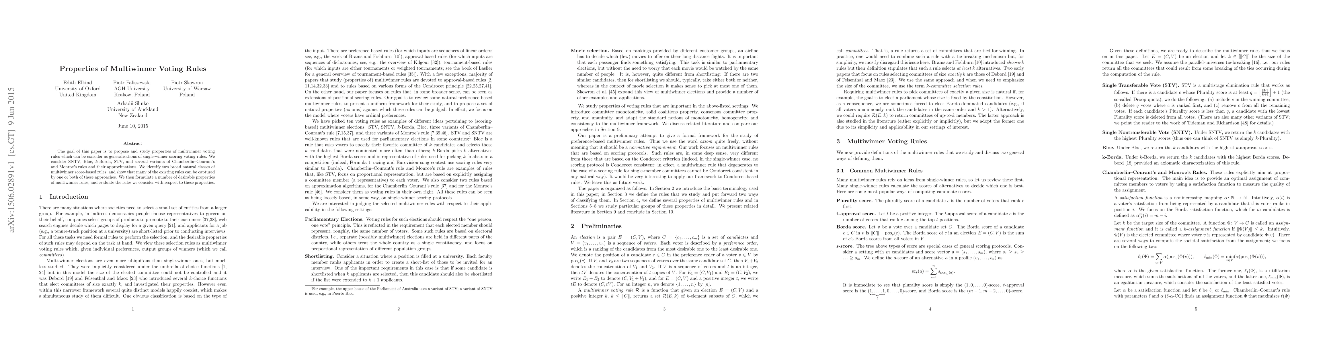 The paper proposes and studies properties of multiwinner voting rules, generalizing single-winner scoring rules. It considers SNTV, Bloc, k-Borda, STV, and variants of Chamberlin-Courant's and Monroe's rules, identifying two broad classes of multiwinner score-based rules.