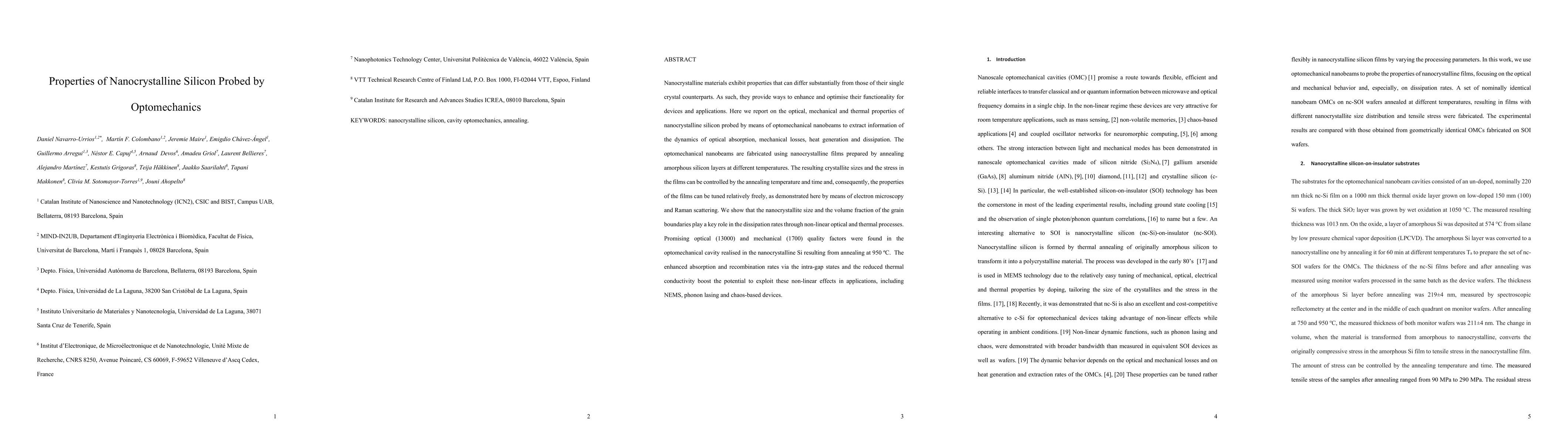 This paper investigates the optomechanical properties of nanocrystalline silicon, revealing that crystallite size and grain boundary volume significantly influence dissipation rates. High-quality factors and enhanced absorption rates suggest potential for applications in NEMS, phonon lasing, and chaos-based devices.