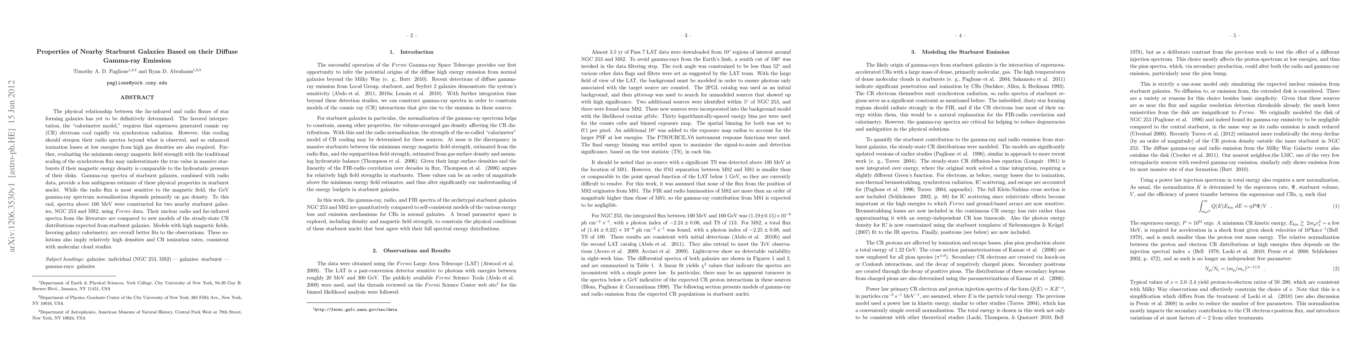 This paper investigates the physical properties of nearby starburst galaxies NGC 253 and M82 using their diffuse gamma-ray emission and compares it with radio data. Models suggest that high magnetic fields and gas densities are required to explain the observed radio spectra, supporting the "calorimeter model" of starburst galaxies.