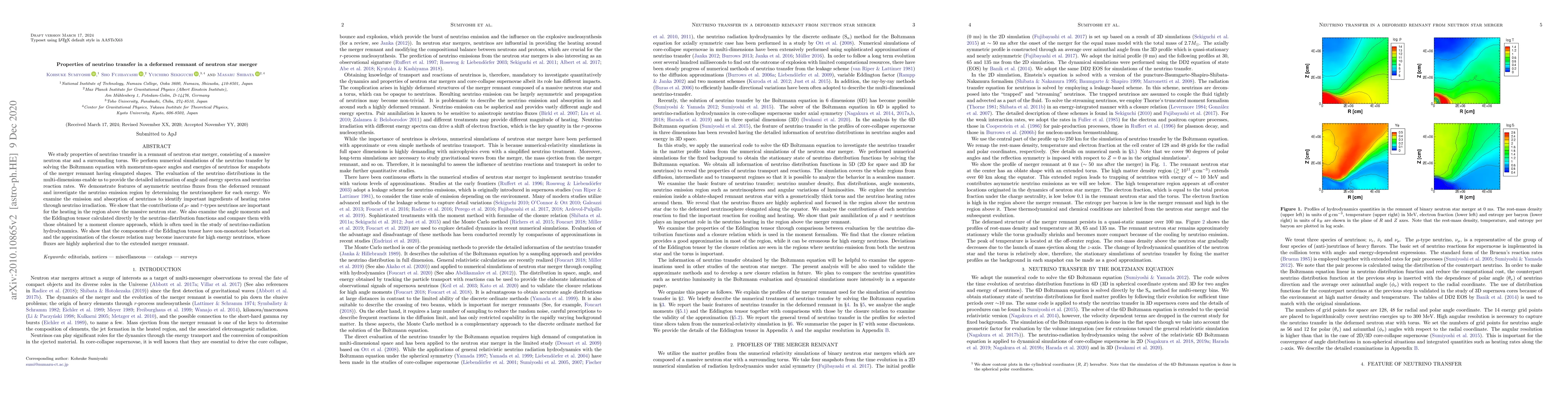 This paper investigates the properties of neutrino transfer in the deformed remnant of a neutron star merger, employing numerical simulations to solve the Boltzmann equation. It highlights asymmetric neutrino fluxes and the importance of $\mu$- and $\tau$-type neutrinos in heating rates, while also comparing direct calculations of the Eddington tensor with moment closure approximations.