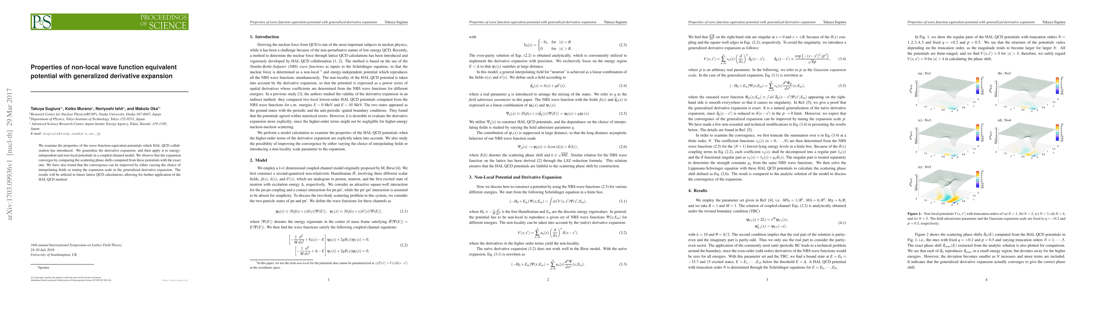 This paper investigates the properties of wave-function-equivalent potentials introduced by the HAL QCD collaboration, applying a generalized derivative expansion to energy-independent and non-local potentials in a coupled-channel model. The study finds that the expansion converges well with exact scattering phase shifts, and suggests improvements through field choice or expansion scale tuning, with implications for future lattice QCD calculations.