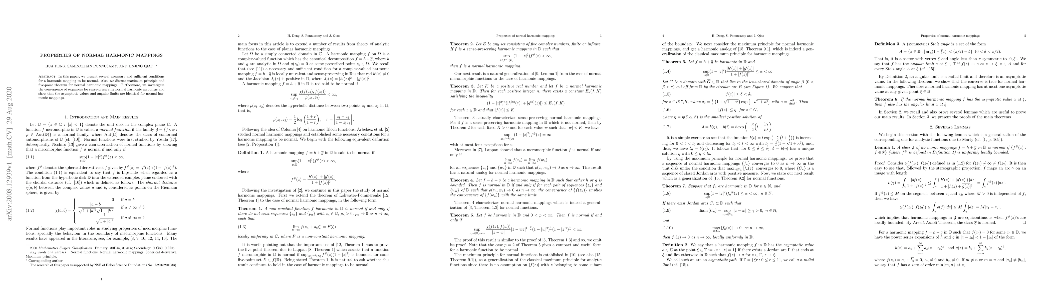 This paper establishes necessary and sufficient conditions for harmonic mappings to be normal, explores the maximum principle and five-point theorem for such mappings, and investigates the convergence of sequences for sense-preserving normal harmonic mappings, proving that their asymptotic values and angular limits are identical.