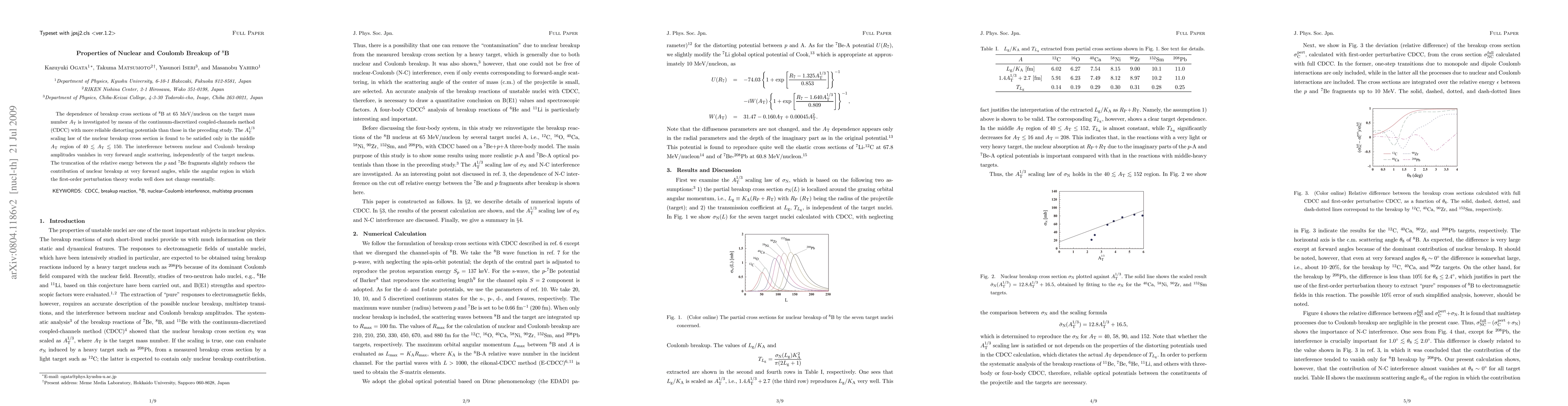 Researchers studied the breakup of 8B at 65 MeV/nucleon using a new method, finding that nuclear breakup cross sections follow an A_T^(1/3) scaling law but only in a specific mass range. The study also found that Coulomb breakup dominates at very forward angles.
