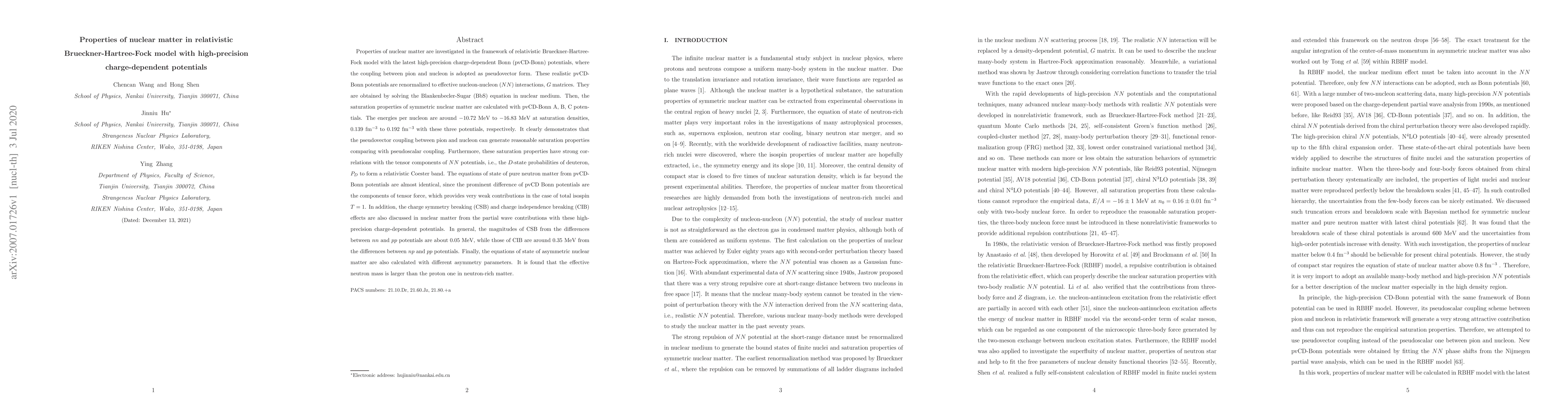 This paper investigates nuclear matter properties using the relativistic Brueckner-Hartree-Fock model with high-precision charge-dependent Bonn potentials. It finds that pseudovector coupling between pion and nucleon generates reasonable saturation properties, with energies per nucleon ranging from $-10.72$ to $-16.83$ MeV at saturation densities, and discusses charge symmetry and independence breaking effects.