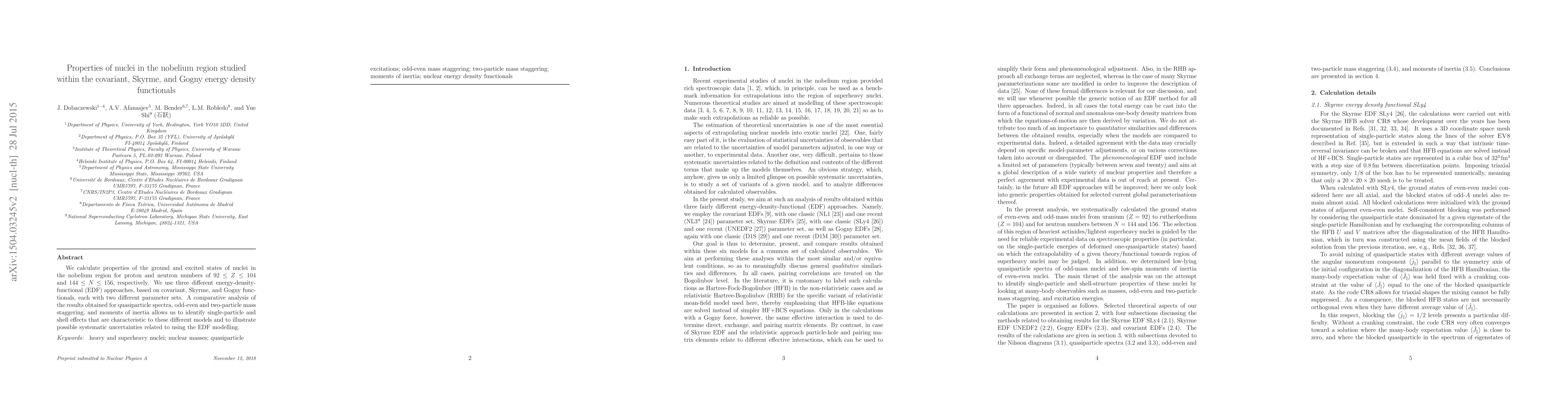 The paper presents a comprehensive analysis of nuclear properties in the nobelium region using covariant, Skyrme, and Gogny EDFs, identifying systematic uncertainties and limitations in current EDF methods.