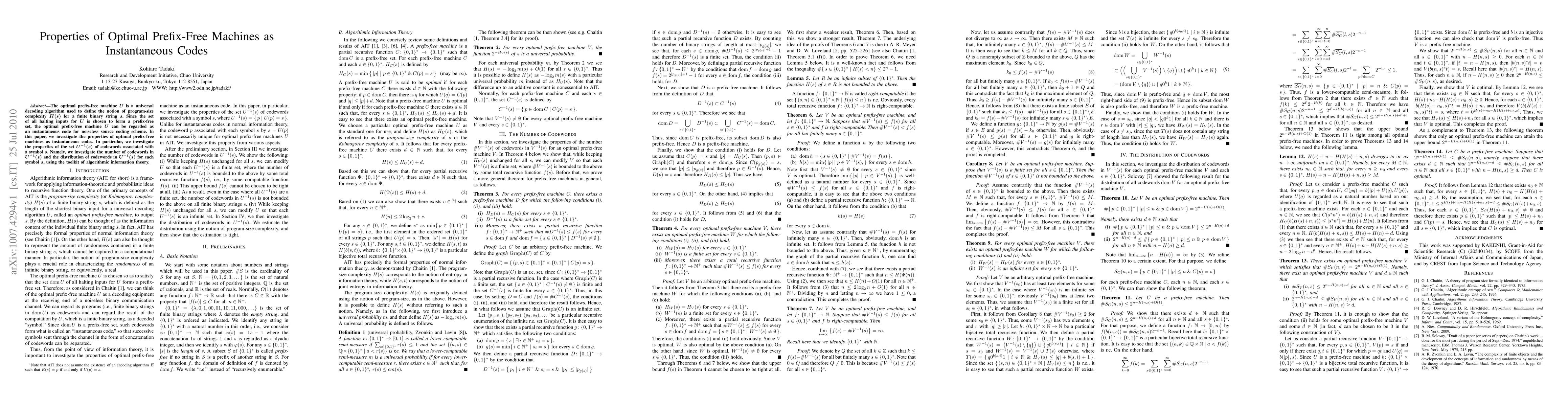 The paper presents several theorems and proofs related to the properties of optimal prefix-free machines as instantaneous codes, including modifications to ensure finite pre-image sets and tightening the bounds on codeword distributions.