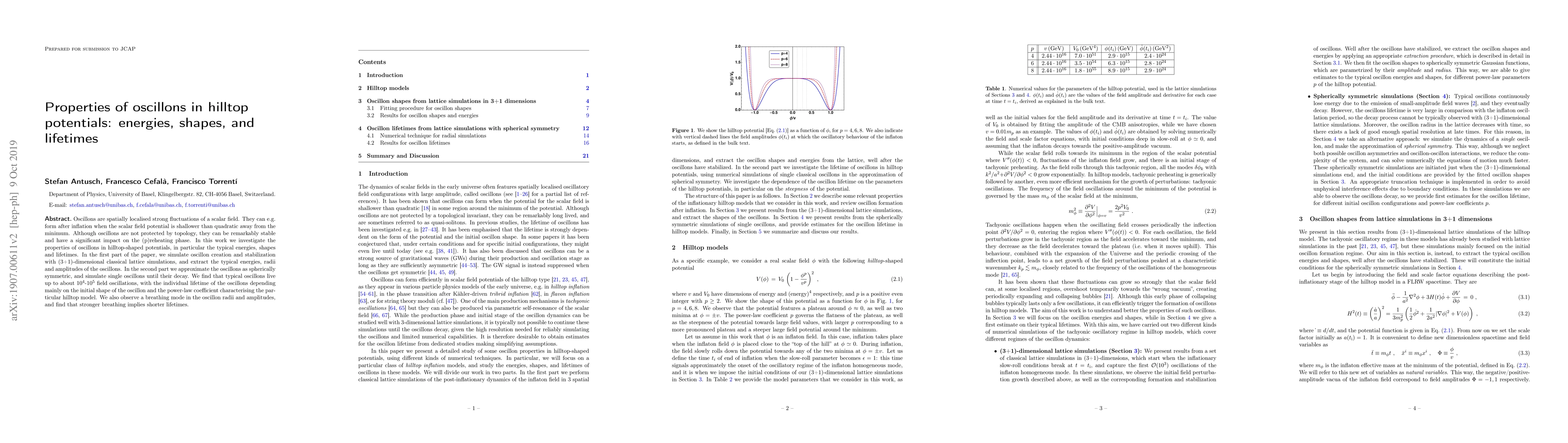 This paper investigates the properties of oscillons—localized strong fluctuations in a scalar field—in hilltop potentials, focusing on their energies, shapes, and lifetimes. Through simulations, it finds that oscillons can be stable for up to 4-5 e-folds, with their lifetimes primarily influenced by initial shape and the potential's power-law coefficient, and that stronger breathing modes correlate with shorter lifetimes.