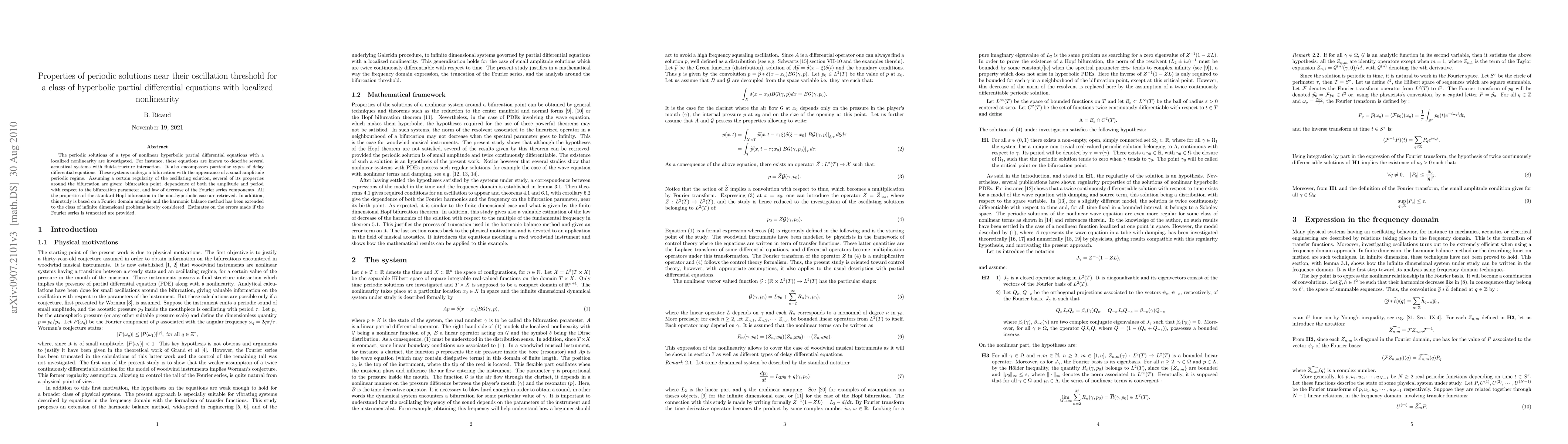 The periodic solutions of a type of nonlinear hyperbolic partial differential equations with a localized nonlinearity are investigated. For instance, these equations are known to describe several acoustical systems with fluid-structure interaction. It also encompasses particular types of delay differential equations. These systems undergo a bifurcation with the appearance of a small amplitude periodic regime. Assuming a certain regularity of the oscillating solution, several of its properties around the bifurcation are given: bifurcation point, dependence of both the amplitude and period with respect to the bifurcation parameter, and law of decrease of the Fourier series components. All the properties of the standard Hopf bifurcation in the non-hyperbolic case are retrieved. In addition, this study is based on a Fourier domain analysis and the harmonic balance method has been extended to the class of infinite dimensional problems hereby considered. Estimates on the errors made if the Fourier series is truncated are provided.