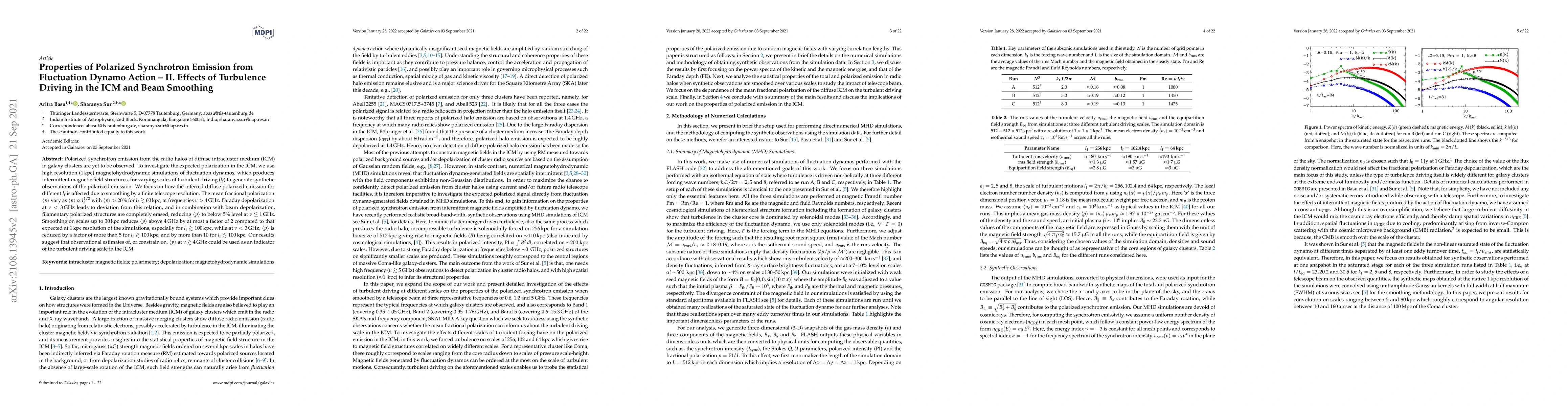 Polarized synchrotron emission from the radio halos of diffuse intracluster medium (ICM) in galaxy clusters are yet to be observed. To investigate the expected polarization in the ICM, we use high resolution ($1$\,kpc) magnetohydrodynamic simulations of fluctuation dynamos, which produces intermittent magnetic field structures, for varying scales of turbulent driving ($l_{\rm f}$) to generate synthetic observations of the polarized emission. We focus on how the inferred diffuse polarized emission for different $l_{\rm f}$ is affected due to smoothing by a finite telescope resolution. The mean fractional polarization $\langle p\rangle$ vary as $\langle p \rangle \propto l_{\rm f}^{1/2}$ with $\langle p \rangle > 20\%$ for $l_{\rm f} \gtrsim 60$\,kpc, at frequencies $\nu > 4\,{\rm GHz}$. Faraday depolarization at $\nu < 3$\,GHz leads to deviation from this relation, and in combination with beam depolarization, filamentary polarized structures are completely erased, reducing $\langle p \rangle$ to below 5\% level at $\nu \lesssim1$\,GHz. Smoothing on scales up to $30$\,kpc reduces $\langle p \rangle$ above $4$\,GHz by at most a factor of 2 compared to that expected at $1$\,kpc resolution of the simulations, especially for $l_{\rm f} \gtrsim 100$\,kpc, while at $\nu < 3$\,GHz, $\langle p \rangle$ is reduced by a factor of more than 5 for $l_{\rm f} \gtrsim 100$\,kpc, and by more than 10 for $l_{\rm f} \lesssim 100$\,kpc. Our results suggest that observational estimates of, or constrain on, $\langle p \rangle$ at $\nu \gtrsim 4$\,GHz could be used as an indicator of the turbulent driving scale in the ICM.