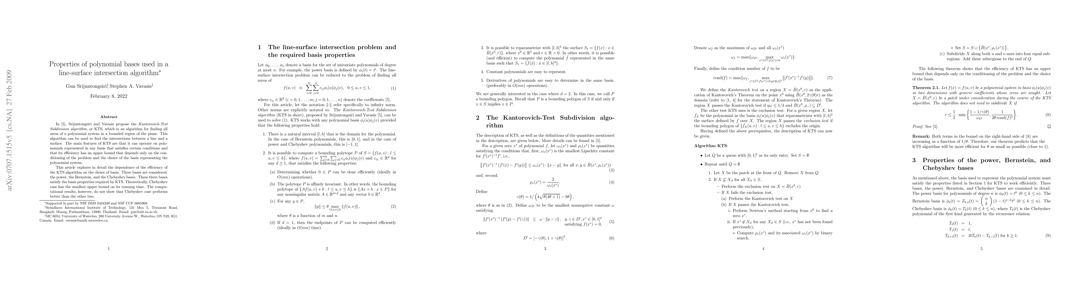 In [5], Srijuntongsiri and Vavasis propose the "Kantorovich-Test Subdivision algorithm", or KTS, which is an algorithm for finding all zeros of a polynomial system in a bounded region of the plane. This algorithm can be used to find the intersections between a line and a surface. The main features of KTS are that it can operate on polynomials represented in any basis that satisfies certain conditions and that its efficiency has an upper bound that depends only on the conditioning of the problem and the choice of the basis representing the polynomial system. This article explores in detail the dependence of the efficiency of the KTS algorithm on the choice of basis. Three bases are considered: the power, the Bernstein, and the Chebyshev bases. These three bases satisfy the basis properties required by KTS. Theoretically, Chebyshev case has the smallest upper bound on its running time. The computational results, however, do not show that Chebyshev case performs better than the other two.