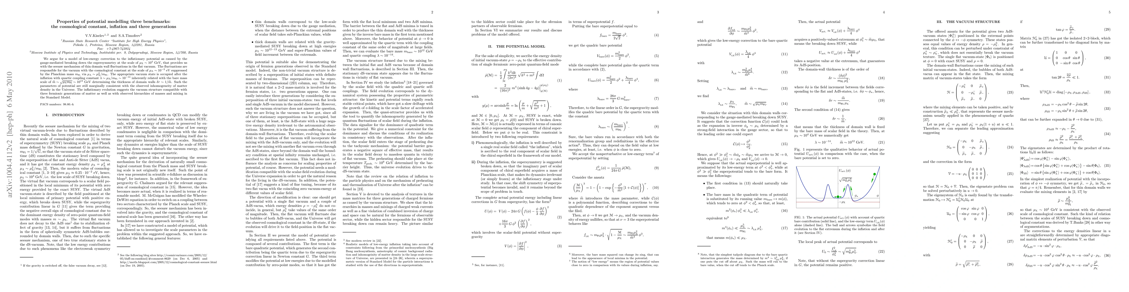 We argue for a model of low-energy correction to the inflationary potential as caused by the gauge-mediated breaking down the supersymmetry at the scale of $\mu_\textsc{x}\sim 10^4$ GeV, that provides us with the seesaw mechanism of thin domain wall fluctuations in the flat vacuum. The fluctuations are responsible for the vacuum with the cosmological constant at the scale of $\mu_\Lambda\sim 10^{-2}$ eV suppressed by the Planckian mass $m_\mathtt{Pl}$ via $\mu_\Lambda\sim\mu_\textsc{x}^2/m_\mathtt{Pl}$. The appropriate vacuum state is occupied after the inflation with quartic coupling constant $\lambda\sim\mu_\textsc{x}/m_\mathtt{Pl}\sim 10^{-14}$ inherently related with the bare mass scale of $\widetilde m\sim\sqrt{\mu_\textsc{x}m_\mathtt{Pl}}\sim 10^{12}$ GeV determining the thickness of domain walls $\delta r\sim1/\widetilde m$. Such the parameters of potential are still marginally consistent with the observed inhomogeneity of matter density in the Universe. The inflationary evolution suggests the vacuum structure compatible with three fermionic generations of matter as well as with observed hierarchies of masses and mixing in the Standard Model.