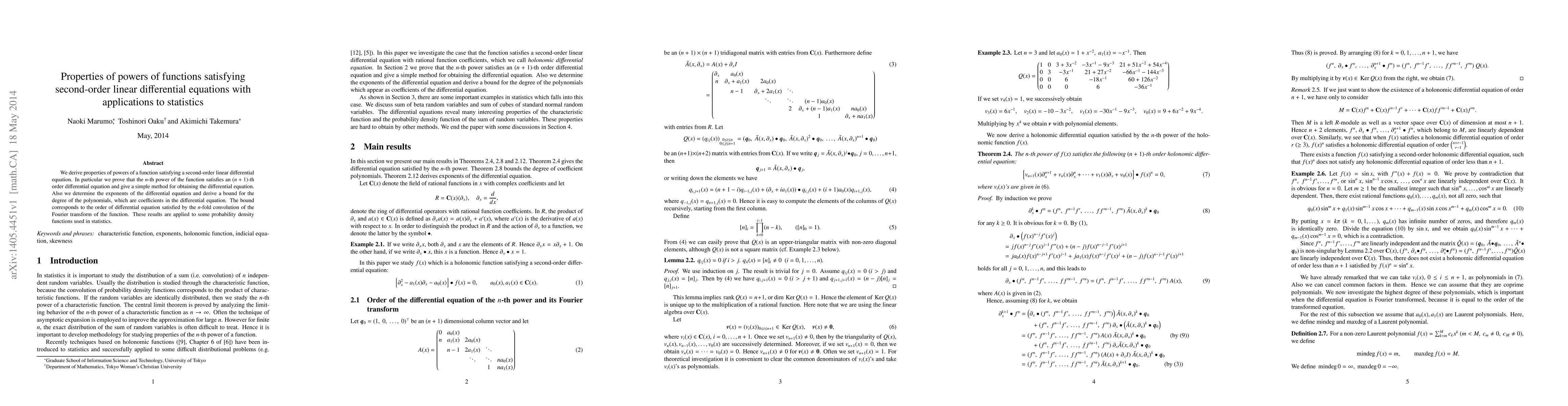 We derive properties of powers of a function satisfying a second-order linear differential equation. In particular we prove that the n-th power of the function satisfies an (n+1)-th order differential equation and give a simple method for obtaining the differential equation. Also we determine the exponents of the differential equation and derive a bound for the degree of the polynomials, which are coefficients in the differential equation. The bound corresponds to the order of differential equation satisfied by the n-fold convolution of the Fourier transform of the function. These results are applied to some probability density functions used in statistics.