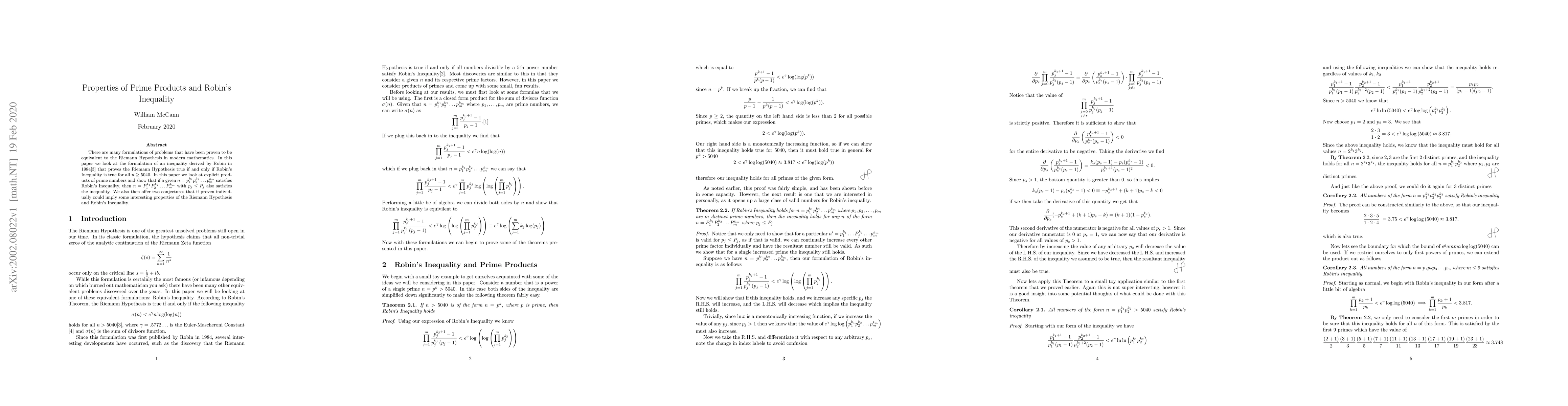 There are many formulations of problems that have been proven to be equivalent to the Riemann Hypothesis in modern mathematics. In this paper we look at the formulation of an inequality derived by Robin in 1984 that proves the Riemann Hypothesis true if and only if Robin's Inequality is true for all $n\geq 5040$. In this paper we look at explicit products of prime numbers and show that if a given $n=p_1^{k_1}p_2^{k_2}\ldots p_m^{k_m}$ satisfies Robin's Inequality, then $n=P_1^{k_1}P_2^{k_2}\ldots P_m^{k_m}$ with $p_j \leq P_j$ also satisfies the inequality. We also then offer two conjectures that if proven individually could imply some interesting properties of the Riemann Hypothesis and Robin's Inequality.