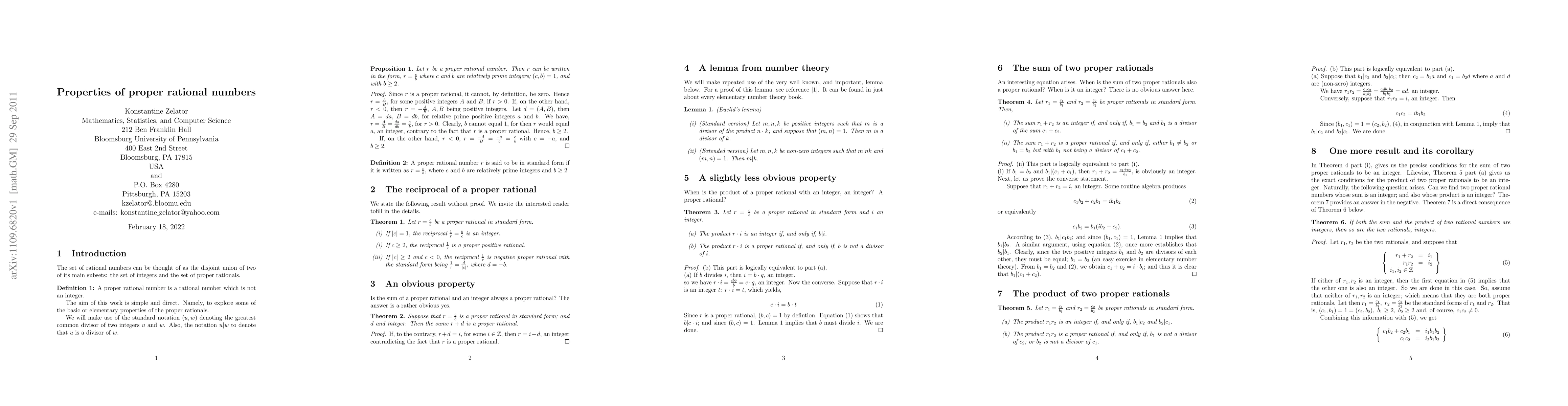 This paper explores basic properties of proper rational numbers, including conditions for their sum and product to be integers, and the existence of rationals with both sum and product as integers.