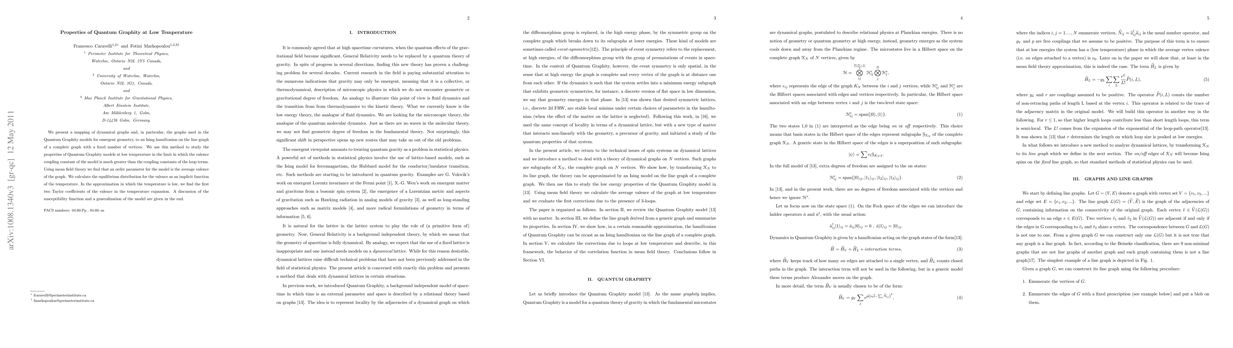 We present a mapping of dynamical graphs and, in particular, the graphs used in the Quantum Graphity models for emergent geometry, into an Ising hamiltonian on the line graph of a complete graph with a fixed number of vertices. We use this method to study the properties of Quantum Graphity models at low temperature in the limit in which the valence coupling constant of the model is much greater than the coupling constants of the loop terms. Using mean field theory we find that an order parameter for the model is the average valence of the graph. We calculate the equilibrium distribution for the valence as an implicit function of the temperature. In the approximation in which the temperature is low, we find the first two Taylor coefficients of the valence in the temperature expansion. A discussion of the susceptibility function and a generalization of the model are given in the end.