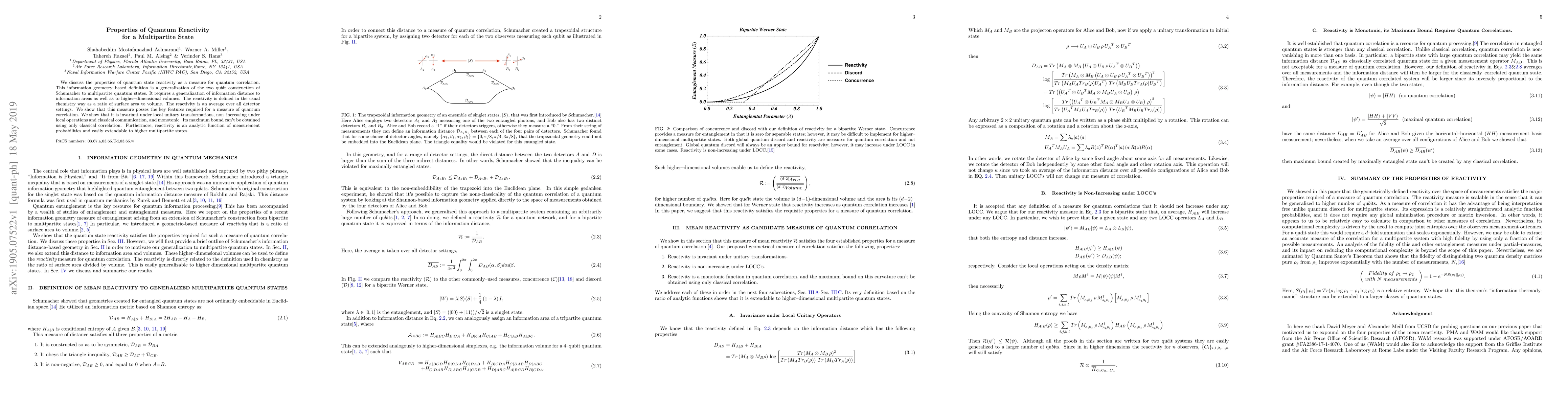 We discuss the properties of quantum state reactivity as a measure for quantum correlation. This information geometry-based definition is a generalization of the two qubit construction of Schumacher to multipartite quantum states. It requires a generalization of information distance to information areas as well as to higher-dimensional volumes. The reactivity is defined in the usual chemistry way as a ratio of surface area to volume. The reactivity is an average over all detector settings. We show that this measure posses the key features required for a measure of quantum correlation. We show that it is invariant under local unitary transformations, non-increasing under local operations and classical communication, and monotonic. Its maximum bound can't be obtained using only classical correlation. Furthermore, reactivity is an analytic function of measurement probabilities and easily extendable to higher multipartite states.