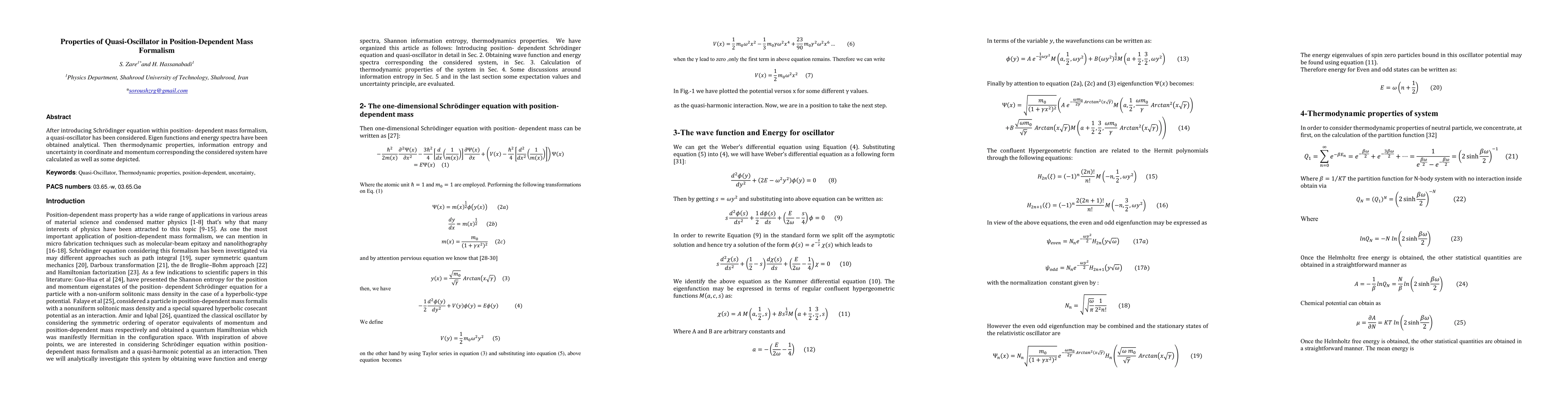 This paper investigates a quasi-oscillator in position-dependent mass formalism, obtaining analytical eigen functions and energy spectra while calculating thermodynamic properties and uncertainty.