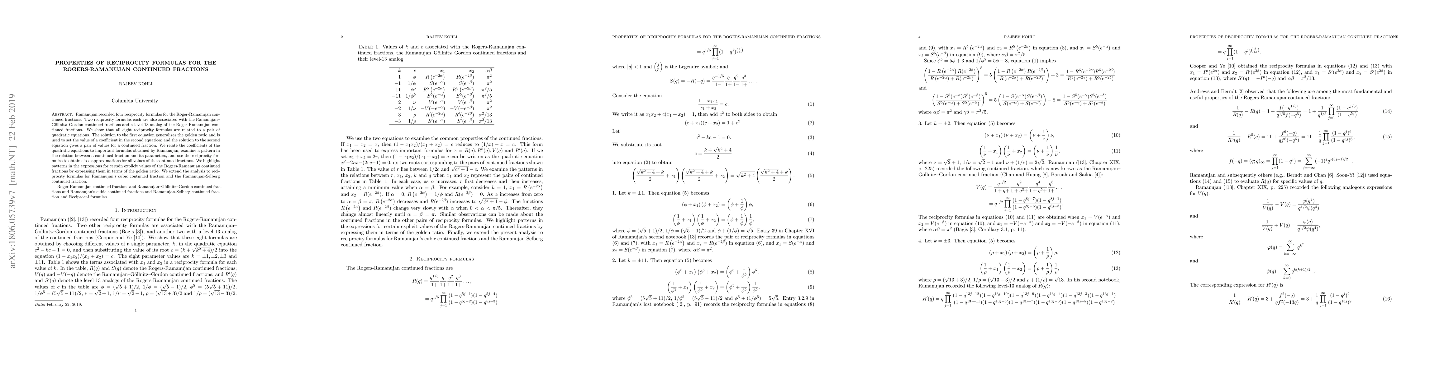 Ramanujan recorded four reciprocity formulas for the Roger-Ramanujan continued fraction. Two reciprocity formulas each are also associated with the Ramanujan--G\"ollnitz--Gordon continued fraction and a level-13 analog of the Roger-Ramanujan continued fraction. We show that all eight reciprocity formulas are related to a pair of quadratic equations. The solution to the first equation generalizes the golden ratio and is used to set the value of a coefficient in the second equation; and the solution to the second equation gives a pair of values for a continued fraction. We relate the coefficients of the quadratic equations to important formulas obtained by Ramanujan, examine the pattern of the relation between a continued fraction and its parameters, and use the reciprocity formulas to obtain close approximations for all values of the continued fraction. We highlight patterns in the expressions for certain explicit values of the Rogers-Ramanujan continued fraction by expressing them in terms of the golden ratio. We extend the results to reciprocity formulas for Ramanujan's cubic continued fraction and the Ramanujan-Selberg continued fraction.