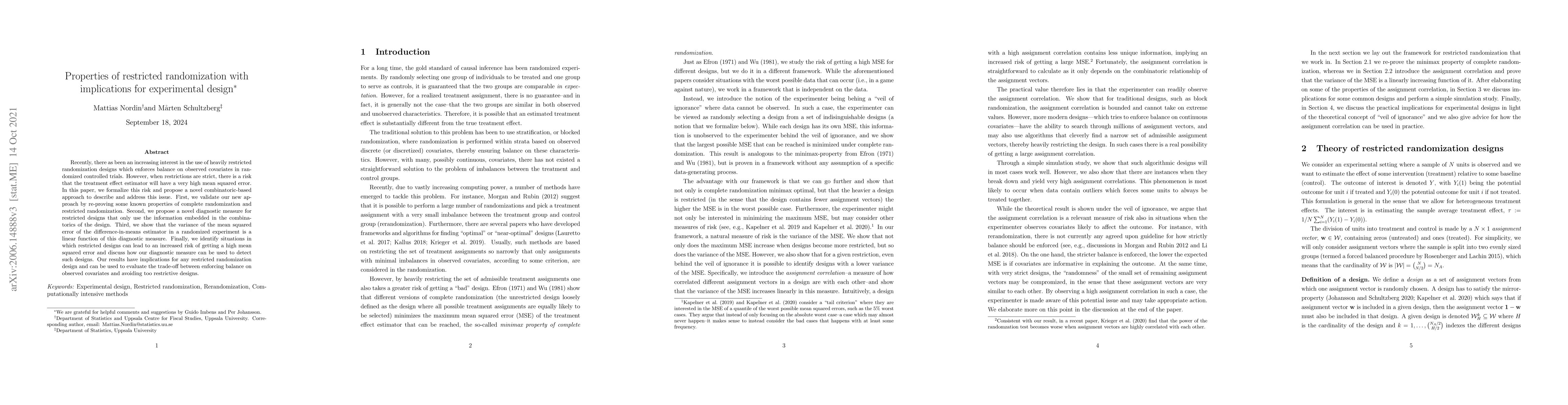 This paper introduces a combinatoric-based approach to assess and mitigate high mean squared error risks in heavily restricted randomization designs used in randomized controlled trials. It validates the approach by re-proving properties of complete and restricted randomization, proposes a diagnostic measure linked to variance of the difference-in-means estimator, and identifies situations where restricted designs may lead to increased mean squared error risk, offering guidance on balancing covariate balance with design strictness.