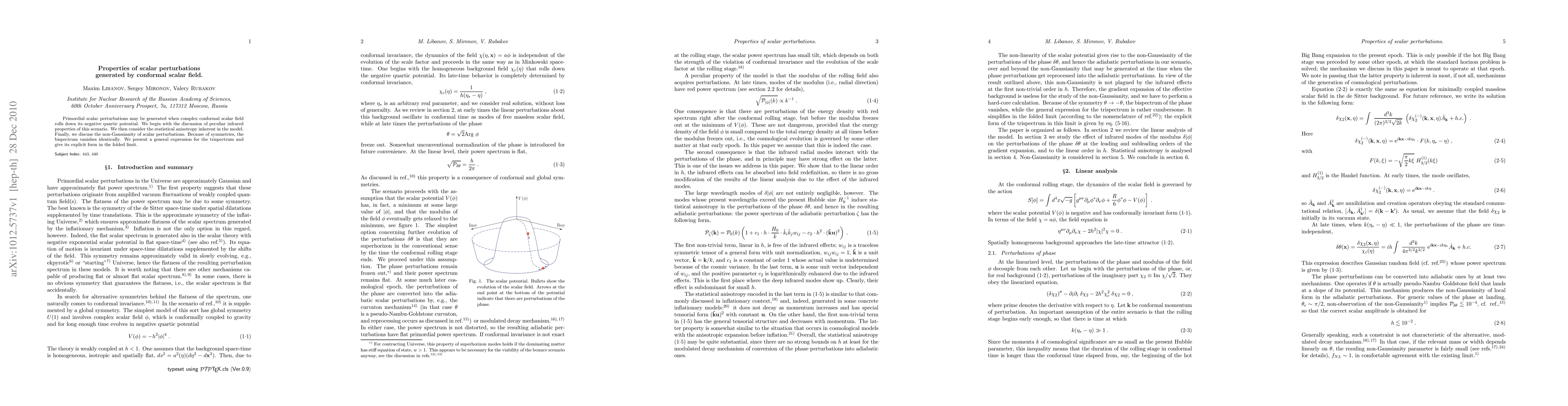 Primordial scalar perturbations may be generated when complex conformal scalar field rolls down its negative quartic potential. We begin with the discussion of peculiar infrared properties of this scenario. We then consider the statistical anisotropy inherent in the model. Finally, we discuss the non-Gaussianity of scalar perturbations. Because of symmetries, the bispectrum vanishes identically. We present a general expression for the trispectrum and give its explicit form in the folded limit.