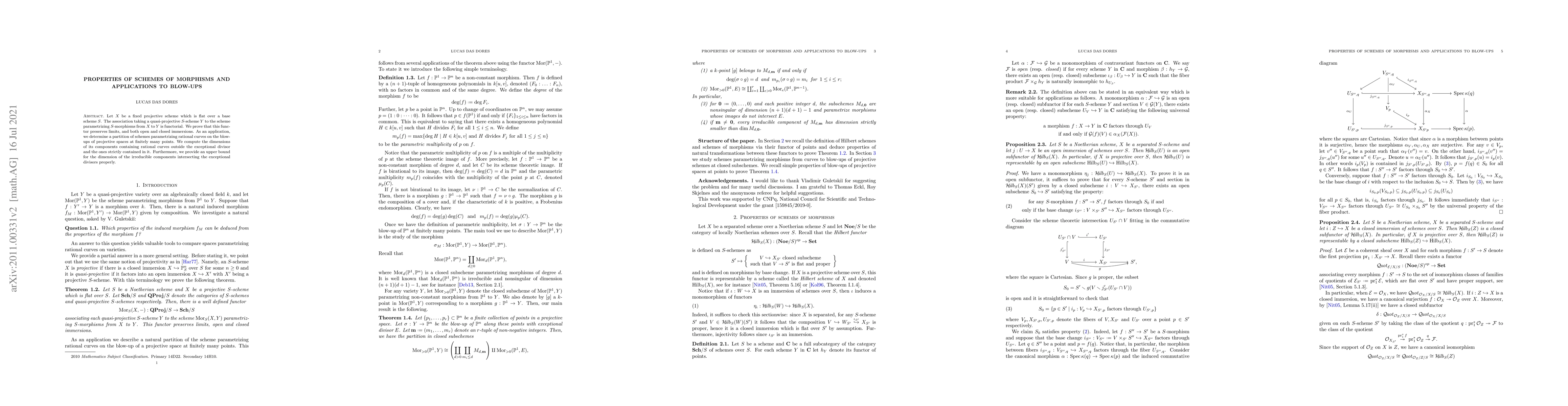 This paper studies the properties of schemes parametrizing morphisms from a fixed projective scheme $X$ to quasi-projective $S$-schemes $Y$, proving functoriality and preservation of limits and immersions. It applies these properties to determine the structure and dimensions of schemes parametrizing rational curves on blow-ups of projective spaces, providing bounds on the dimensions of components intersecting exceptional divisors.
