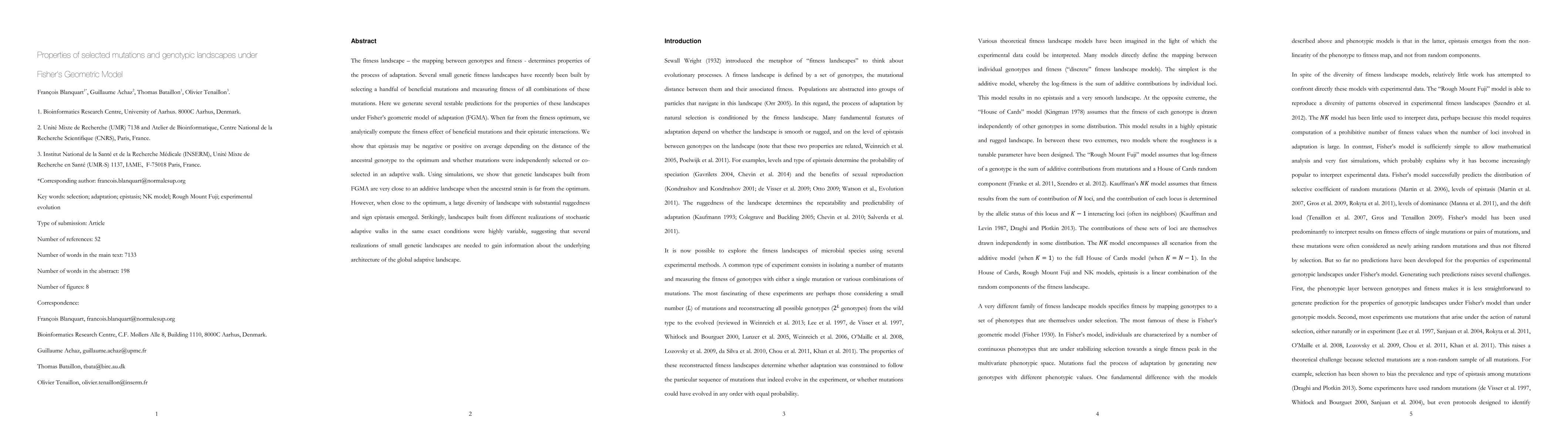 The fitness landscape - the mapping between genotypes and fitness - determines properties of the process of adaptation. Several small genetic fitness landscapes have recently been built by selecting a handful of beneficial mutations and measuring fitness of all combinations of these mutations. Here we generate several testable predictions for the properties of these landscapes under Fisher's geometric model of adaptation (FGMA). When far from the fitness optimum, we analytically compute the fitness effect of beneficial mutations and their epistatic interactions. We show that epistasis may be negative or positive on average depending on the distance of the ancestral genotype to the optimum and whether mutations were independently selected or co-selected in an adaptive walk. Using simulations, we show that genetic landscapes built from FGMA are very close to an additive landscape when the ancestral strain is far from the optimum. However, when close to the optimum, a large diversity of landscape with substantial ruggedness and sign epistasis emerged. Strikingly, landscapes built from different realizations of stochastic adaptive walks in the same exact conditions were highly variable, suggesting that several realizations of small genetic landscapes are needed to gain information about the underlying architecture of the global adaptive landscape.