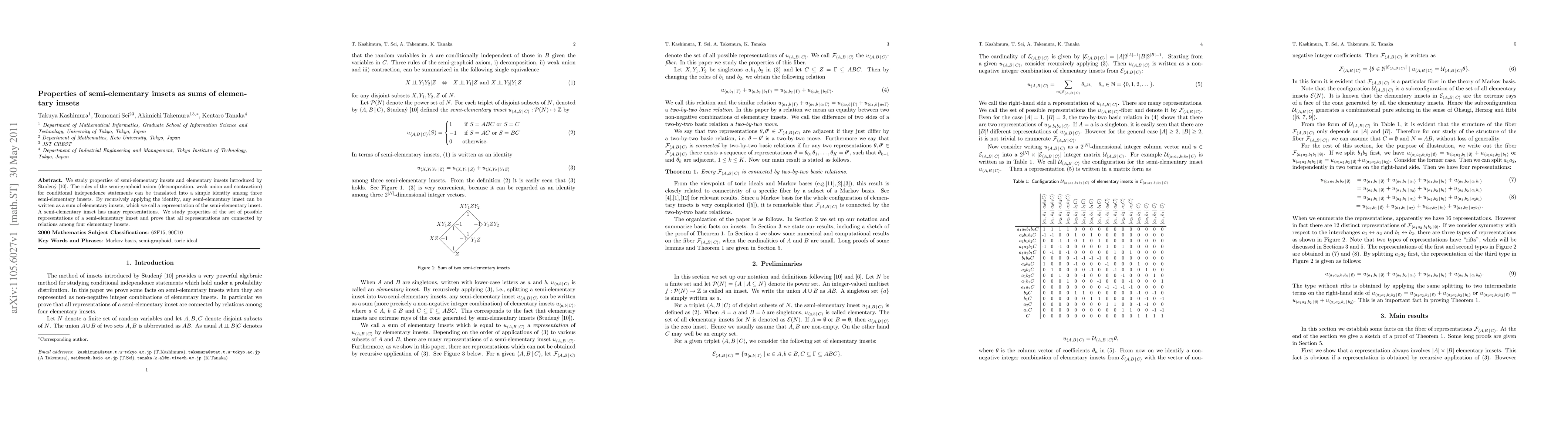 This paper explores the properties of semi-elementary imsets, showing that they can be expressed as a sum of elementary imsets through recursive application of a simple identity. It investigates the set of possible representations of these imsets and proves that all representations are interrelated via relations among four elementary imsets.
