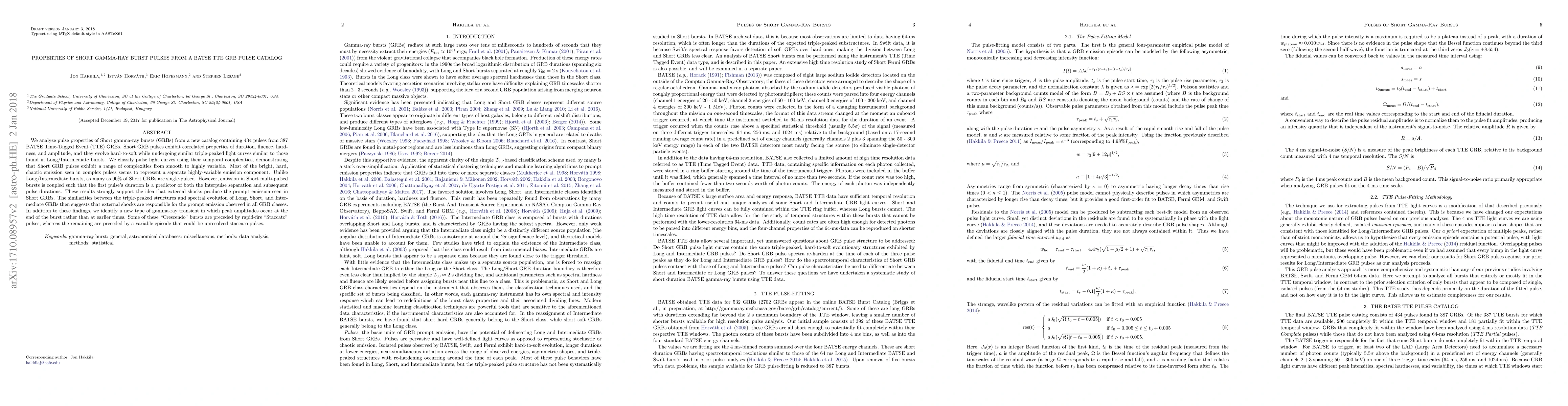 We analyze pulse properties of Short gamma-ray bursts (GRBs) from a new catalog containing 434 pulses from 387 BATSE Time-Tagged Event (TTE) GRBs. Short GRB pulses exhibit correlated properties of duration, fluence, hardness, and amplitude, and they evolve hard-to-soft while undergoing similar triple-peaked light curves similar to those found in Long/Intermediate bursts. We classify pulse light curves using their temporal complexities, demonstrating that Short GRB pulses exhibit a range of complexities from smooth to highly variable. Most of the bright, hard, chaotic emission seen in complex pulses seems to represent a separate highly-variable emission component. Unlike Long/Intermediate bursts, as many as 90\% of Short GRBs are single-pulsed. However, emission in Short multi-pulsed bursts is coupled such that the first pulse's duration is a predictor of both the interpulse separation and subsequent pulse durations. These results strongly support the idea that external shocks produce the prompt emission seen in Short GRBs. The similarities between the triple-peaked structures and spectral evolution of Long, Short, and Intermediate GRBs then suggests that external shocks are responsible for the prompt emission observed in all GRB classes. In addition to these findings, we identify a new type of gamma-ray transient in which peak amplitudes occur at the end of the burst rather than at earlier times. Some of these "Crescendo" bursts are preceded by rapid-fire "Staccato" pulses, whereas the remaining are preceded by a variable episode that could be unresolved staccato pulses.