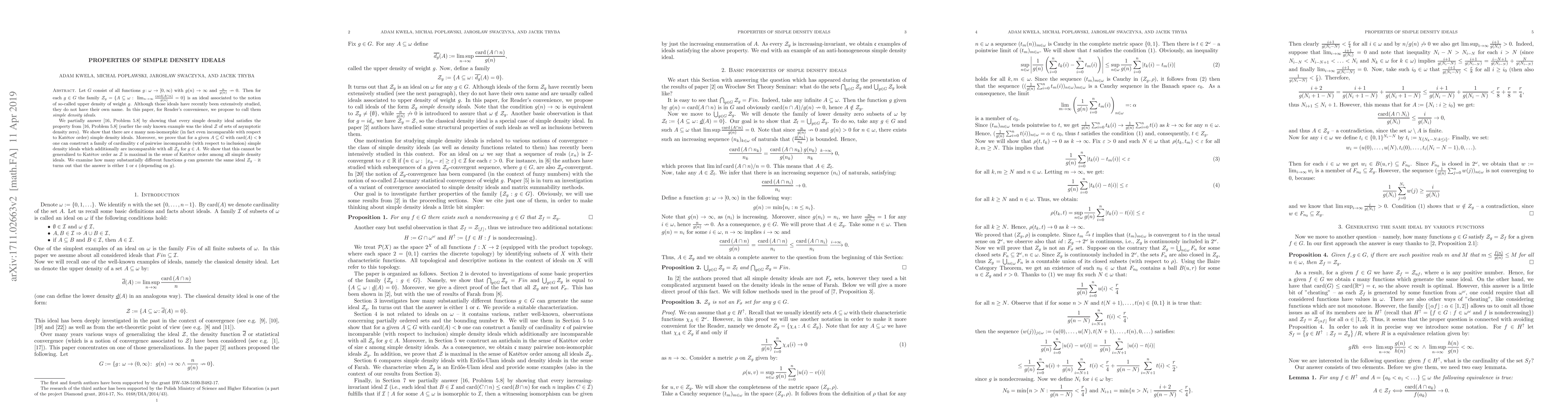 This paper introduces and studies 'simple density ideals', a previously unnamed concept in mathematics. It demonstrates the existence of at least $mathfrak{c}$ non-isomorphic simple density ideals, some of which are incomparable in Katv{e}tov order. The research also shows that for certain subsets A of G with cardinality less than $mathfrak{b}$, it's possible to construct $mathfrak{c}$ incomparable simple density ideals, even with respect to inclusion and to existing ideals $mathcal{Z}_g$ for $g in A$. The study concludes that each simple density ideal $mathcal{Z}_g$ is generated by either one or $mathfrak{c}$ substantially different functions g.