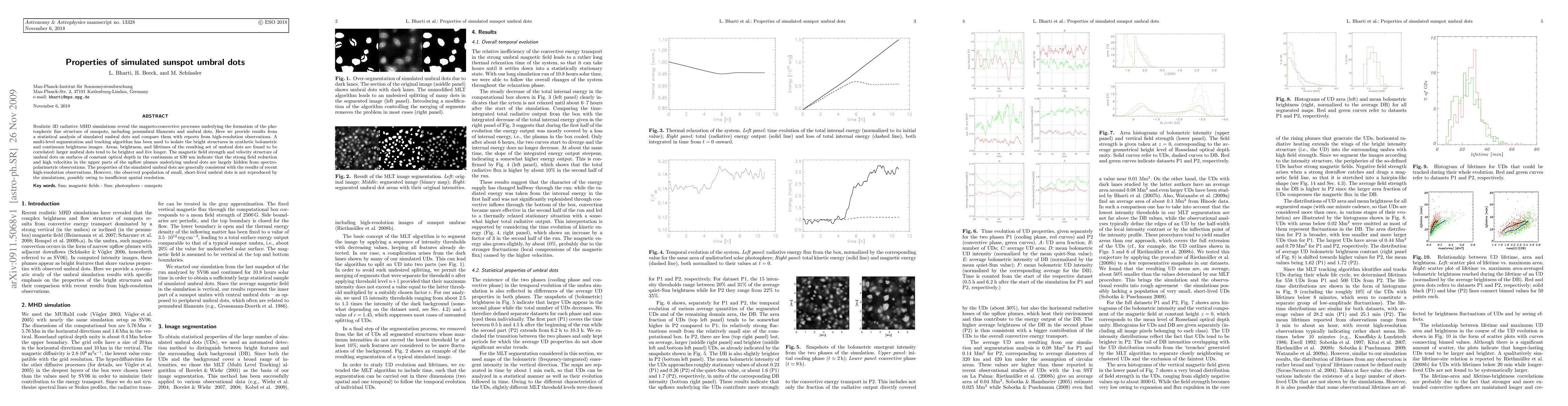 Realistic 3D radiative MHD simulations reveal the magneto-convective processes underlying the formation of the photospheric fine structure of sunspots, including penumbral filaments and umbral dots. Here we provide results from a statistical analysis of simulated umbral dots and compare them with reports from high-resolution observations. A multi-level segmentation and tracking algorithm has been used to isolate the bright structures in synthetic bolometric and continuum brightness images. Areas, brightness, and lifetimes of the resulting set of umbral dots are found to be correlated: larger umbral dots tend to be brighter and live longer. The magnetic field strength and velocity structure of umbral dots on surfaces of constant optical depth in the continuum at 630 nm indicate that the strong field reduction and high velocities in the upper parts of the upflow plumes underlying umbral dots are largely hidden from spectro-polarimetric observations. The properties of the simulated umbral dots are generally consistent with the results of recent high-resolution observations. However, the observed population of small, short-lived umbral dots is not reproduced by the simulations, possibly owing to insufficient spatial resolution.