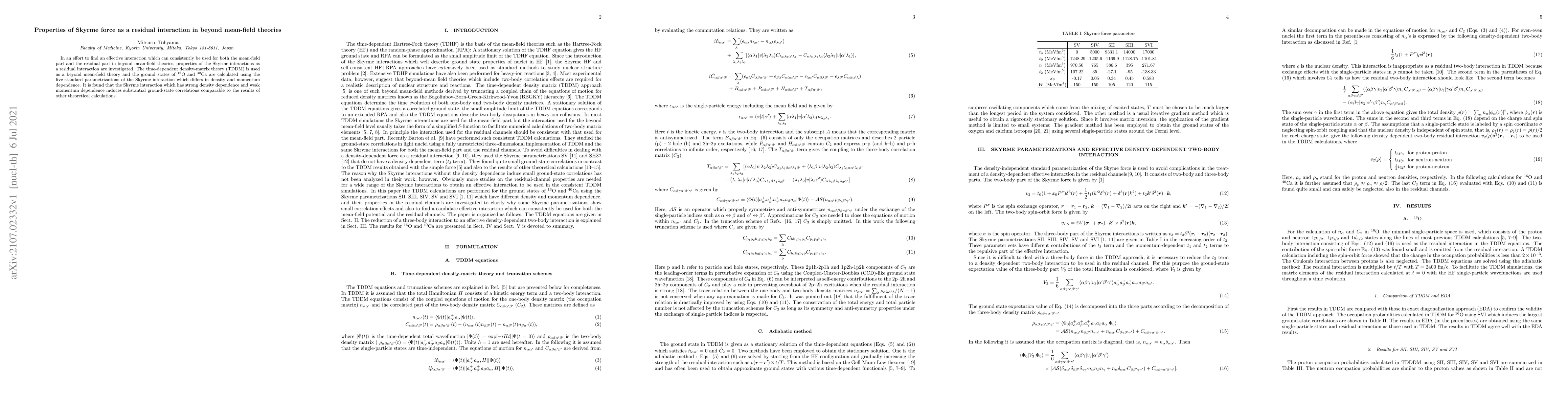 In an effort to find an effective interaction which can consistently be used for both the mean-field part and the residual part in beyond mean-field theories, properties of the Skyrme interactions as a residual interaction are investigated. The time-dependent density-matrix theory (TDDM) is used as a beyond mean-field theory and the ground states of $^{16}$O and $^{40}$Ca are calculated using the five standard parametrizations of the Skyrme interaction which differs in density and momentum dependence. It is found that the Skyrme interaction which has strong density dependence and weak momentum dependence induces substantial ground-state correlations comparable to the results of other theoretical calculations.