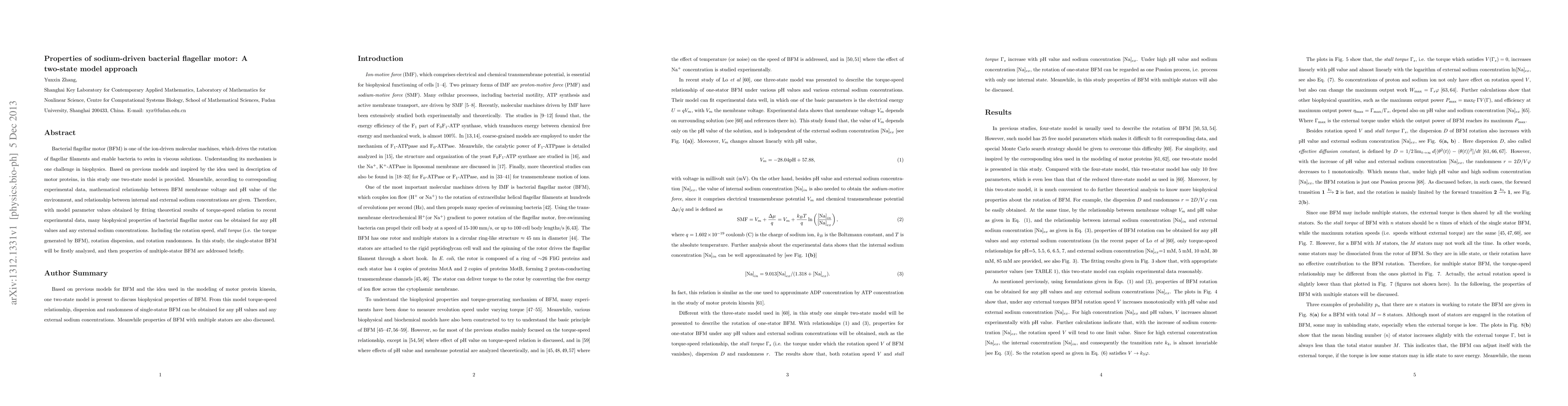 Bacterial flagellar motor (BFM) is one of the ion-driven molecular machines, which drives the rotation of flagellar filaments and enable bacteria to swim in viscous solutions. Understanding its mechanism is one challenge in biophysics. Based on previous models and inspired by the idea used in description of motor proteins, in this study one two-state model is provided. Meanwhile, according to corresponding experimental data, mathematical relationship between BFM membrane voltage and pH value of the environment, and relationship between internal and external sodium concentrations are given. Therefore, with model parameter values obtained by fitting theoretical results of torque-speed relation to recent experimental data, many biophysical properties of bacterial flagellar motor can be obtained for any pH values and any external sodium concentrations. Including the rotation speed, stall torque (i.e. the torque generated by BFM), rotation dispersion, and rotation randomness. In this study, the single-stator BFM will be firstly analyzed, and then properties of multiple-stator BFM are addressed briefly.