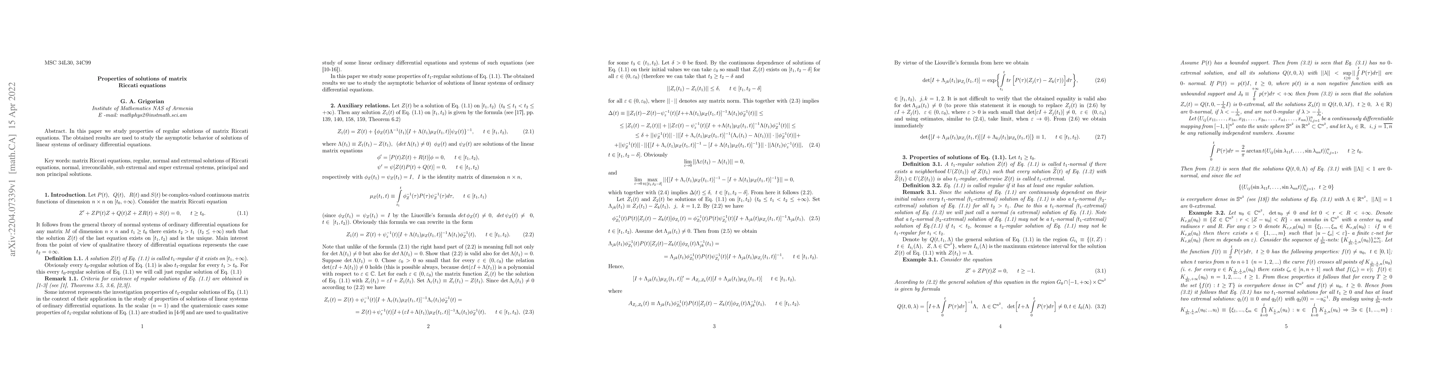 Summary: This paper explores the properties of regular solutions to matrix Riccati equations, with a focus on their implications for understanding the asymptotic behavior of linear systems of ordinary differential equations.