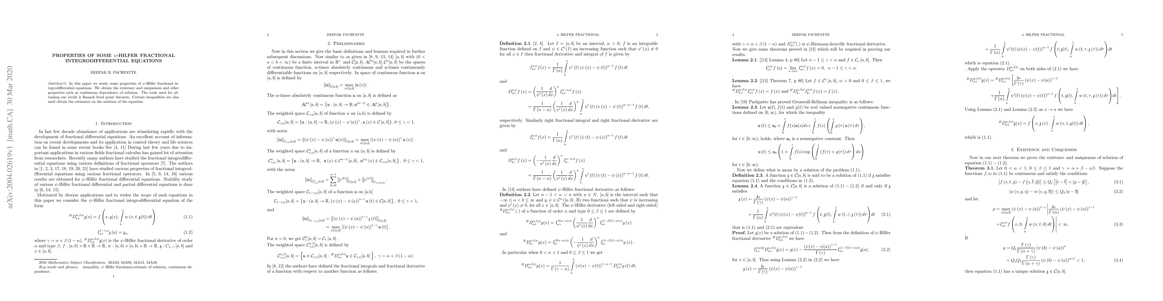 In this paper we study some properties of $\psi$-Hilfer fractional integrodifferential equations. We obtain the existence and uniqueness and other properties such as continuous dependence of solution. The tools used for obtaining our result is Banach fixed point theorem. Certain inequalities are also used obtain the estimates on the solution of the equation.