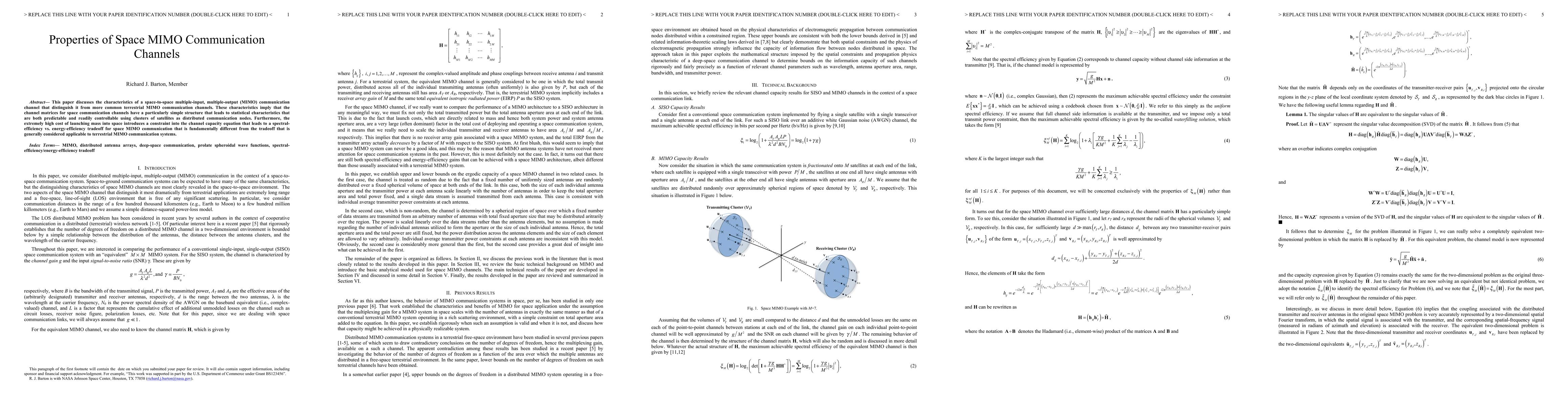 This paper discusses the characteristics of a space-to-space multiple-input, multiple-output (MIMO) communication channel that distinguish it from more common terrestrial MIMO communication channels. These characteristics imply that the channel matrices for space communication channels have a particularly simple structure that leads to statistical characteristics that are both predictable and readily controllable using clusters of satellites as distributed communication nodes. Furthermore, the extremely high cost of launching mass into space introduces a constraint into the channel capacity equation that leads to a spectral-efficiency vs. energy-efficiency tradeoff for space MIMO communication that is fundamentally different from the tradeoff that is generally considered applicable to terrestrial MIMO communication systems.