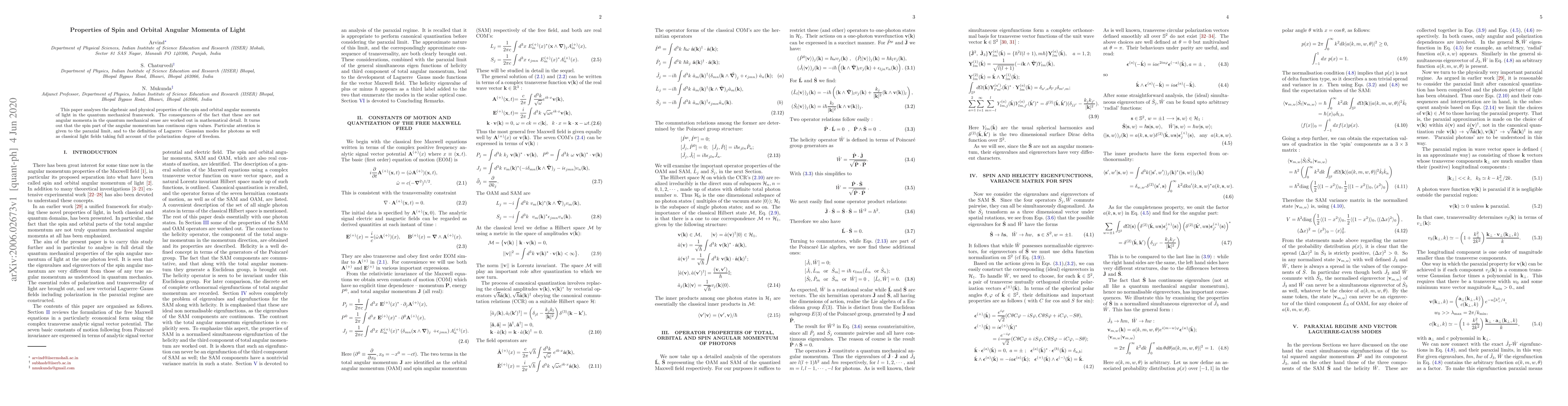 The paper presents a thorough examination of the quantum mechanical properties of light's angular momenta, including the construction of ideal eigenvectors and the definition of paraxial vectorial Laguerre-Gaussian modes.