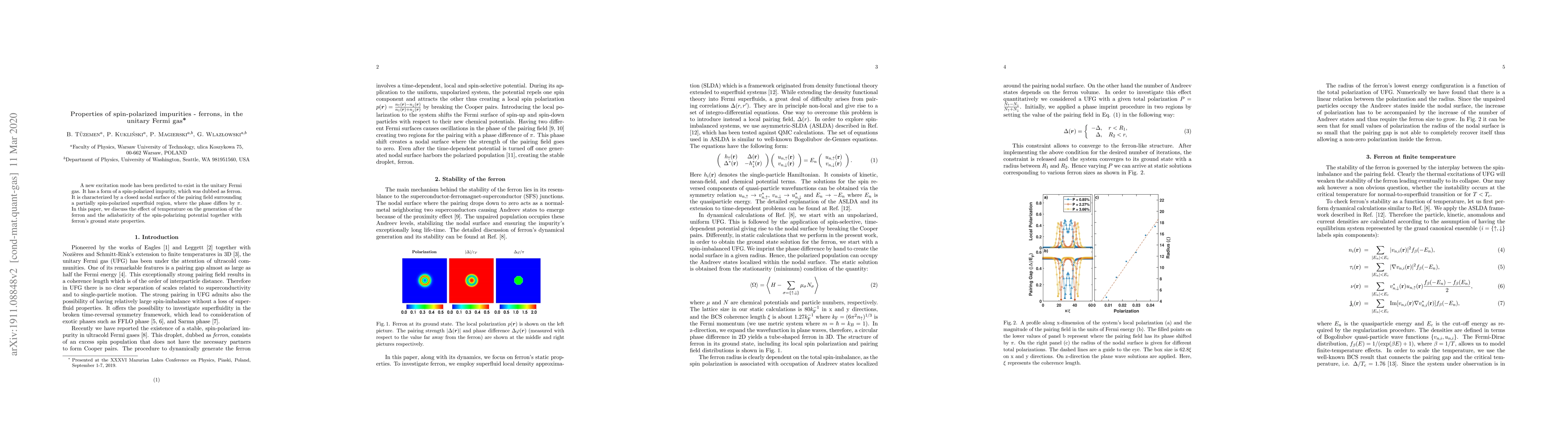 A new excitation mode has been predicted to exist in the unitary Fermi gas. It has a form of a spin-polarized impurity, which was dubbed as ferron. It is characterized by a closed nodal surface of the pairing field surrounding a partially spin-polarized superfluid region, where the phase differs by $\pi$. In this paper, we discuss the effect of temperature on the generation of the ferron and the adiabaticity of the spin-polarizing potential together with ferron's ground state properties.