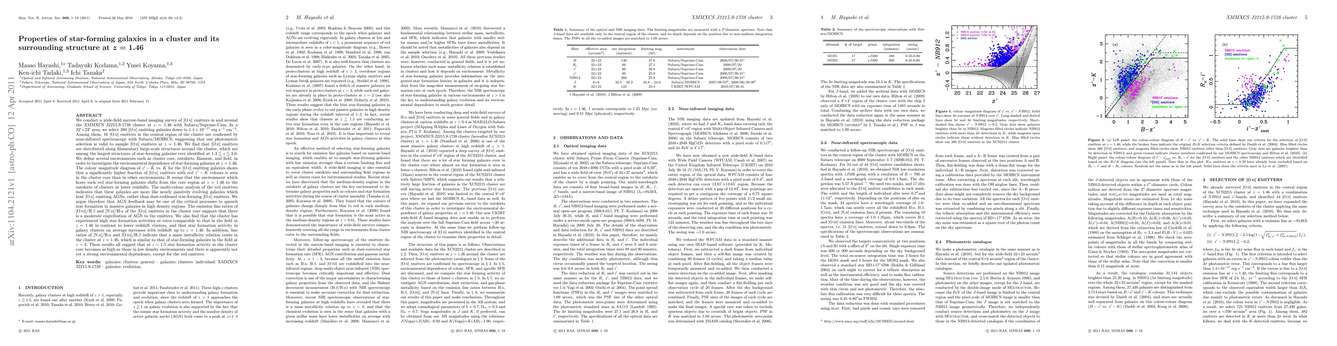This study investigates star-forming galaxies in and around the XMMXCS J2215.9-1738 cluster at z=1.46, finding that [OII] emitters align with filamentary structures and are more prevalent on the red sequence in the cluster core, suggesting AGN feedback may quench star formation in high-density regions.