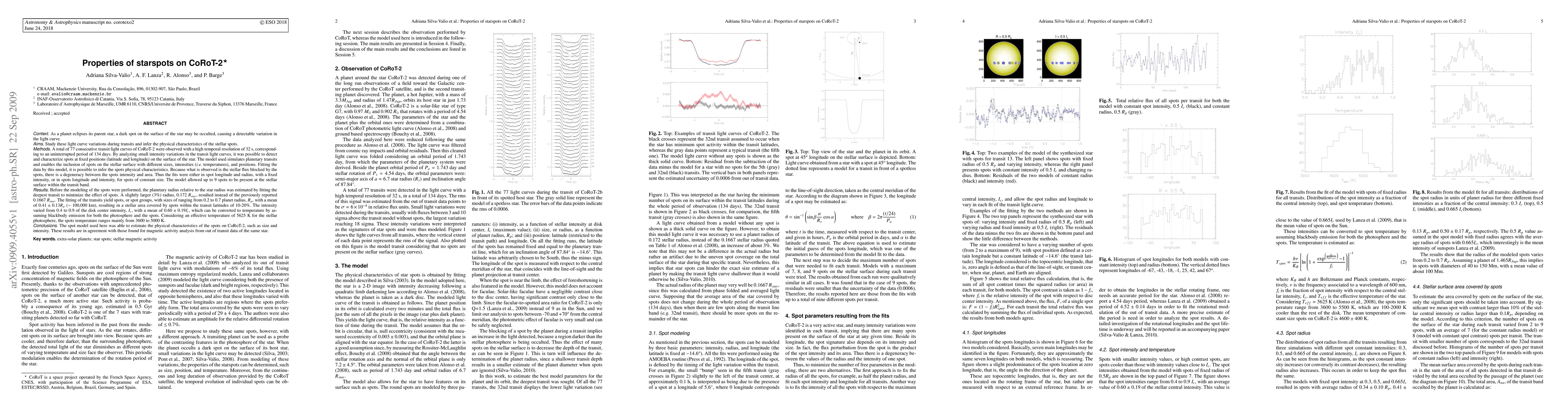 As a planet eclipses its parent star, a dark spot on the surface of the star may be occulted, causing a detectable variation in the light curve. A total of 77 consecutive transit light curves of CoRoT-2 were observed with a high temporal resolution of 32 s, corresponding to an uninterrupted period of 134 days. By analyzing small intensity variations in the transit light curves, it was possible to detect and characterize spots at fixed positions (latitude and longitude) on the surface of the star. The model used simulates planetary transits and enables the inclusion of spots on the stellar surface with different sizes, intensities (i.e. temperatures), and positions. Fitting the data by this model, it is possible to infer the spots physical characteristics. The fits were either in spot longitude and radius, with a fixed intensity, or in spots longitude and intensity, for spots of constant size. Before the modeling of the spots were performed, the planetary radius relative to the star radius was estimated by fitting the deepest transit to minimize the effect of spots. A slightly larger (3%) radius, 0.172 Rstar, resulted instead of the previously reported 0.1667 Rstar . The fitting of the transits yield spots, or spot groups, with sizes of ranging from 0.2 to 0.7 planet radius, Rp, with a mean of (0.41 +/- 0.13) Rp (~100,000 km), resulting in a stellar area covered by spots within the transit latitudes of 10-20%. The intensity varied from 0.4 to 0.9 of the disk center intensity, Ic, with a mean of (0.60 +/- 0.19) Ic, which can be converted to temperature by assuming an effective temperature of 5625 K for the stellar photosphere, the spots temperature ranges mainly from 3600 to 5000 K. The results from the spot modeling are in agreement with those found for magnetic activity analysis from out of transit data of the same star.