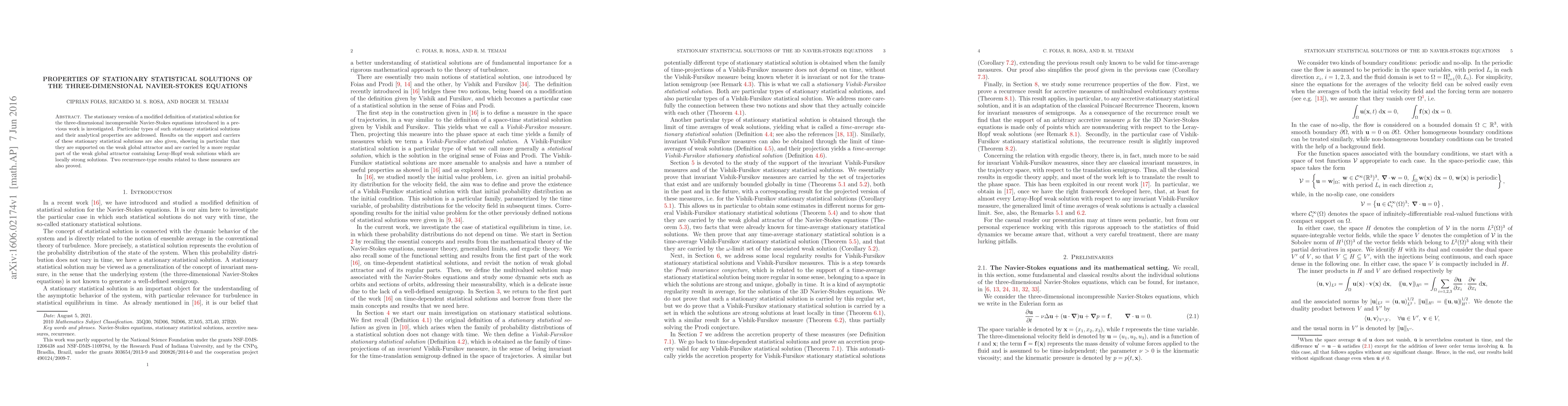 This paper investigates stationary statistical solutions of the three-dimensional incompressible Navier-Stokes equations, showing they are supported on the weak global attractor and carried by a more regular part containing Leray-Hopf weak solutions. It also proves recurrence-type results related to these measures.