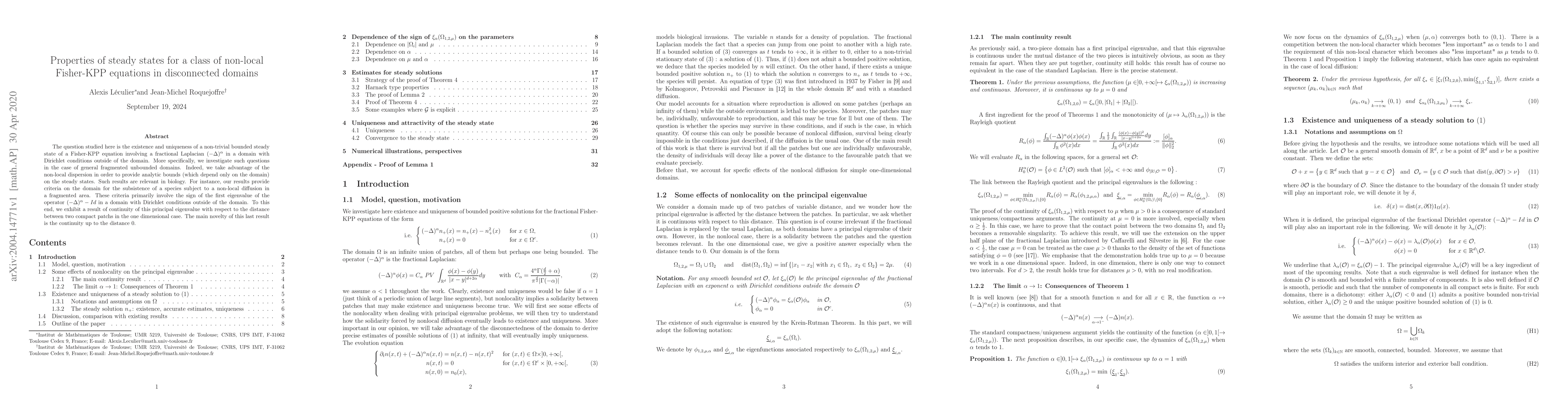 The question studied here is the existence and uniqueness of a non-trivial bounded steady state of a Fisher-KPP equation involving a fractional Laplacian (--$\Delta$)^$\alpha$ in a domain with Dirichlet conditions outside of the domain. More specifically, we investigate such questions in the case of general fragmented unbounded domains. Indeed, we take advantage of the non-local dispersion in order to provide analytic bounds (which depend only on the domain) on the steady states. Such results are relevant in biology. For instance, our results provide criteria on the domain for the subsistence of a species subject to a non-local diffusion in a fragmented area. These criteria primarily involve the sign of the first eigenvalue of the operator (--$\Delta$)^$\alpha$ -- Id in a domain with Dirichlet conditions outside of the domain. To this end, we exhibit a result of continuity of this principal eigenvalue with respect to the distance between two compact patchs in the one dimensional case. The main novelty of this last result is the continuity up to the distance 0.